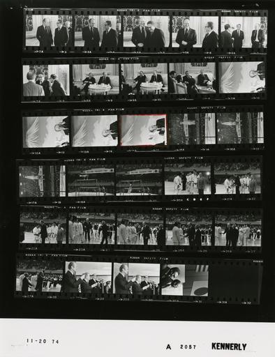 | Keywords: Ford A2057 NLGRF photo contact sheet (1974-11-20)(Gerald Ford Library).jpg White House Photographic Office WHPO is housed at the Gerald R Ford Presidential Library a branch of the National Archives and Records Administration NARA <br/><br/> This file is a 200 dpi photo contact sheet having images from roll of film A2057 of the August 9 1974 - January 20 1977 Gerald R Ford White House Photographic Office Series A0001-A9999 and B0001-B2886 photographs <br/><br/> The date on the photo contact sheet is the date the roll of film was processed not necessarily the date the photographs were taken See table below for additional details 1974-11-20 Gerald R Ford Presidential Library Image http //www fordlibrarymuseum gov/library/whphotos/A2057_NLGRF jpg A2057_NLGRF jpg from http //www fordlibrarymuseum gov/library/whphotos/19741120whpo pdf White House Photographs November 20 1974 of the http //www fordlibrarymuseum gov/Library/whphotos/whpo asp White House Photographic Collection page White House Photographic Office WHPO <br/> Creator David Hume Kennerly PD-USGov Institution Institution Gerald R Ford Presidential Library Table wikitable sortable + Photo contact sheet A2057 U S President Ford Administration Gerald R Ford Library Frame s Tone Subject proper Subject generic Names Geographic Location Photographer Date - 28A-29A BW Trip to Japan - 1st Visit to Japan by Sitting U S President - Reception Sponsored by Japanese Diet - Local Time standing side by side; head and shoulder portraits GRF Kissinger Tokyo Japan Ohura Hotel - Akebono Room Kennerly 1974-11-20 - 2A-5A BW Trip to Japan - 1st Visit to Japan by Sitting U S President - Prior to Arrival of Prime Minister Kakuei Tanaka - Local Time standing talking smiling laughing GRF Kissinger Tokyo Japan Akasaka Palace Kennerly 1974-11-20 - 6A BW Trip to Japan - 1st Visit to Japan by Sitting U S President - Prior to Arrival of Prime Minister Kakuei Tanaka - Head of Suite of Honour - Local Time standing talking GRF Nobuhiko Ushiba Others Tokyo Japan Akasaka Palace Kennerly 1974-11-20 - 7A BW Trip to Japan - 1st Visit to Japan by Sitting U S President - Prior to Arrival of Prime Minister Kakuei Tanaka - Local Time standing talking Kissinger Habib Scowcroft Tokyo Japan Akasaka Palace Kennerly 1974-11-20 - 8A-10A BW Trip to Japan - 1st Visit to Japan by Sitting U S President - Face to Face Meeting with Prime Minister - Local Time seated talking; all not in every frame GRF Kakuei Tanaka Others Tokyo Japan Akasaka Palace - Second Floor Salon Kennerly 1974-11-20 - 11A-14A BW Trip to Japan - 1st Visit to Japan by Sitting U S President - Prior to Speech at Japan Press Club Luncheon - Local Time seated wearing headphones; listening to introduction GRF Tokyo Japan Imperial Hotel Kennerly 1974-11-20 - 15A-19A BW Trip to Japan - 1st Visit to Japan by Sitting U S President - Exhibition of Traditional and Modern Japanese Athletics - Local Time performing on various apparatus Gymnasts Tokyo Japan Budokan Sports Arena Kennerly 1974-11-20 - 20A-27A BW Trip to Japan - 1st Visit to Japan by Sitting U S President - Exhibition of Traditional and Modern Japanese Athletics - Local Time greeting handshaking walking waving GRF Athletes Tokyo Japan Budokan Sports Arena Kennerly 1974-11-20 - 28A-29A BW Trip to Japan - 1st Visit to Japan by Sitting U S President - Reception Sponsored by Japanese Diet - Speaker of the House of Representatives - Local Time standing raising glasses in toast GRF Shigesaburo Maeo Japanese Legislators Tokyo Japan Ohura Hotel - Akebono Room Kennerly 1974-11-20 Gerald R Ford Presidential Library and Museum-cooperation PD-USGov Contact sheets by the Ford White House November 1974 Photographs by David Hume Kennerly from 1974 |