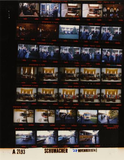 | Keywords: Ford A2193 NLGRF photo contact sheet (1974-11-28)(Gerald Ford Library).jpg White House Photographic Office WHPO is housed at the Gerald R Ford Presidential Library a branch of the National Archives and Records Administration NARA <br/><br/> This file is a 200 dpi photo contact sheet having images from roll of film A2193 of the August 9 1974 - January 20 1977 Gerald R Ford White House Photographic Office Series A0001-A9999 and B0001-B2886 photographs <br/><br/> The date on the photo contact sheet is the date the roll of film was processed not necessarily the date the photographs were taken See table below for additional details 1974-11-28 Gerald R Ford Presidential Library Image http //www fordlibrarymuseum gov/library/whphotos/A2193_NLGRF jpg A2193_NLGRF jpg from http //www fordlibrarymuseum gov/library/whphotos/19741128whpo pdf White House Photographs November 28 1974 of the http //www fordlibrarymuseum gov/Library/whphotos/whpo asp White House Photographic Collection page White House Photographic Office WHPO - Schumacher PD-USGov Institution Institution Gerald R Ford Presidential Library Table wikitable sortable + Photo contact sheet A2193 U S President Ford Administration Gerald R Ford Library Frame s Tone Subject proper Subject generic Names Geographic Location Photographer Date - 3 Color 1930 Grand Rapids South High School Football Team GRF seated back to camera GRF 30-30 Club Member Green Room Schumacher 1974-11-28 - 4-6 Color Tour of White House for 1930 Grand Rapids South High School Football Team - Chief White House Usher standing -all not in frame GRF 30-30 Club Spouses Scouten White House Rooms Schumacher 1974-11-28 - 7-9 Color Tour of White House for 1930 Grand Rapids South High School Football Team standing around table - all not in every frame GRF 30-30 Club Spouses Cabinet Room Schumacher 1974-11-28 - 10 Color 1930 Grand Rapids South High School Football Team posing on Colonnade Steps 30-30 Club Rose Garden Schumacher 1974-11-28 - 11-17 Color 1930 Grand Rapids South High School Football Team standing assuming football poses; GRF and McGee holding football - all not in every frame GRF Art Brown Silas Sikes McGee Others Rose Garden Schumacher 1974-11-28 - 18 Color 1930 Grand Rapids South High School Football Team seated in GRF's chair 30-30 Club Member Oval Office Schumacher 1974-11-28 - 19-24 Color 1930 Grand Rapids South High School Football Team standing behind desk posing GRF 30-30 Club Members Oval Office Schumacher 1974-11-28 - 25-27 Color 1930 Grand Rapids South High School Football Team standing behind desk posing GRF Betty Ford 30-30 Club Member Spouses Oval Office Schumacher 1974-11-28 - 28 Color Member of 30-30 Club; 1930 Grand Rapids South High School Football Team standing talking posing GRF Silas Sikes McGee Oval Office Schumacher 1974-11-28 - 29 Color Member of 30-30 Club; 1930 Grand Rapids South High School Football Team standing talking posing GRF Silas Sikes McGee Betty Ford Oval Office Schumacher 1974-11-28 - 30-31 Color Member of 30-30 Club; 1930 Grand Rapids South High School Football Team handshaking saying goodbye GRF Silas Sikes McGee South Portico Schumacher 1974-11-28 - 32-36 Color Departure of 30-30 Club; 1930 Grand Rapids South High School Football Team GRF waving goodbye talking into cars GRF Others South Driveway Schumacher 1974-11-28 Gerald R Ford Presidential Library and Museum-cooperation PD-USGov Contact sheets by the Ford White House November 1974 |