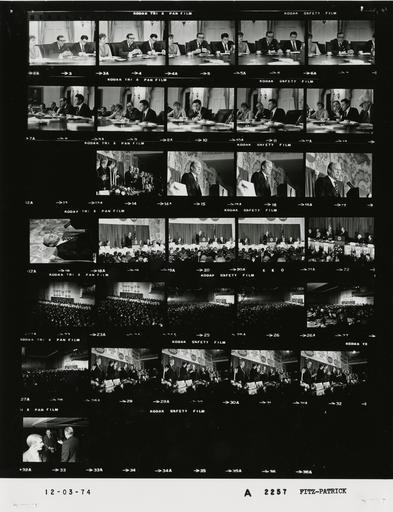 | Keywords: Ford A2257 NLGRF photo contact sheet (1974-12-03)(Gerald Ford Library).jpg White House Photographic Office WHPO is housed at the Gerald R Ford Presidential Library a branch of the National Archives and Records Administration NARA <br/><br/> This file is a 200 dpi photo contact sheet having images from roll of film A2257 of the August 9 1974 - January 20 1977 Gerald R Ford White House Photographic Office Series A0001-A9999 and B0001-B2886 photographs <br/><br/> The date on the photo contact sheet is the date the roll of film was processed not necessarily the date the photographs were taken See table below for additional details 1974-12-03 Gerald R Ford Presidential Library Image http //www fordlibrarymuseum gov/library/whphotos/A2257_NLGRF jpg A2257_NLGRF jpg from http //www fordlibrarymuseum gov/library/whphotos/19741203whpo pdf White House Photographs December 3 1974 of the http //www fordlibrarymuseum gov/Library/whphotos/whpo asp White House Photographic Collection page White House Photographic Office WHPO - Fitz-Patrick PD-USGov Institution Institution Gerald R Ford Presidential Library Table wikitable sortable + Photo contact sheet A2257 U S President Ford Administration Gerald R Ford Library Frame s Tone Subject proper Subject generic Names Geographic Location Photographer Date - 3-12 BW Domestic Council Higher Education Review Meeting -Assistant Secretary for Education HEW ; Commissioner for Education; Assistant Secretary for Planning and Evaluation HEW seated at table - all not in every frame; Bell only in last frame Virginia Trotter Dent Weinberger Terrel Bell Others Cabinet Room Fitz-Patrick 1974-12-03 - 13 BW Fitz-Patrick 1974-12-03 - 14 BW Appearance Before American Conference on Trade GRF standing others standing applauding GRF Platform Guests Washington DC Sheraton-Park Hotel Fitz-Patrick 1974-12-03 - 15-18 BW Appearance Before American Conference on Trade speaking at podium GRF Washington DC Sheraton-Park Hotel Fitz-Patrick 1974-12-03 - 19-28 BW Appearance Before American Conference on Trade GRF speaking at podium others seated listening - all not in every frame; various angles and distances GRF Platform Guests Others Washington DC Sheraton-Park Hotel Fitz-Patrick 1974-12-03 - 29-32 BW Appearance Before American Conference on Trade GRF standing others standing applauding GRF Platform Guests Washington DC Sheraton-Park Hotel Fitz-Patrick 1974-12-03 - 33 BW Following Appearance Before American Conference on Trade - Chairman First National City Corporation greeting handshaking GRF Walter Wriston Washington DC Sheraton-Park Hotel Fitz-Patrick 1974-12-03 Gerald R Ford Presidential Library and Museum-cooperation PD-USGov Contact sheets by the Ford White House December 1974 |