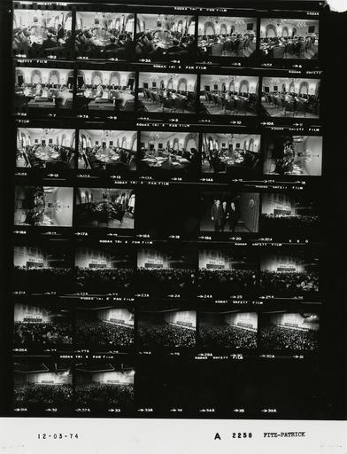 | Keywords: Ford A2258 NLGRF photo contact sheet (1974-12-03)(Gerald Ford Library).jpg White House Photographic Office WHPO is housed at the Gerald R Ford Presidential Library a branch of the National Archives and Records Administration NARA <br/><br/> This file is a 200 dpi photo contact sheet having images from roll of film A2258 of the August 9 1974 - January 20 1977 Gerald R Ford White House Photographic Office Series A0001-A9999 and B0001-B2886 photographs <br/><br/> The date on the photo contact sheet is the date the roll of film was processed not necessarily the date the photographs were taken See table below for additional details 1974-12-03 Gerald R Ford Presidential Library Image http //www fordlibrarymuseum gov/library/whphotos/A2258_NLGRF jpg A2258_NLGRF jpg from http //www fordlibrarymuseum gov/library/whphotos/19741203whpo pdf White House Photographs December 3 1974 of the http //www fordlibrarymuseum gov/Library/whphotos/whpo asp White House Photographic Collection page White House Photographic Office WHPO - Fitz-Patrick PD-USGov Institution Institution Gerald R Ford Presidential Library Table wikitable sortable + Photo contact sheet A2258 U S President Ford Administration Gerald R Ford Library Frame s Tone Subject proper Subject generic Names Geographic Location Photographer Date - 2-18 BW Domestic Council Higher Education Review Meeting -Assistant Secretary for Education HEW ; Commissioner for Education; Assistant Secretary for Planning and Evaluation HEW seated around table - all not in every frame GRF Weinberger Ash Virginia Trotter Terrel Bell William Morrill Timmons O'Neill Marsh Hartmann Cole Semerad Cabinet Room Fitz-Patrick 1974-12-03 - 19 BW Fitz-Patrick 1974-12-03 - 20 BW Prior to Appearance Before American Conference on Trade - Chairman First National City Corporation; President Pepsico Incorporated walking talking GRF Walter Wriston Donald Kendall Washington DC Sheraton-Park Hotel Fitz-Patrick 1974-12-03 - 21-33 BW Appearance Before American Conference on Trade GRF speaking at podium others seated listening - long shots various angles GRF Platform Guests Others Washington DC Sheraton-Park Hotel Fitz-Patrick 1974-12-03 Gerald R Ford Presidential Library and Museum-cooperation PD-USGov Contact sheets by the Ford White House December 1974 |