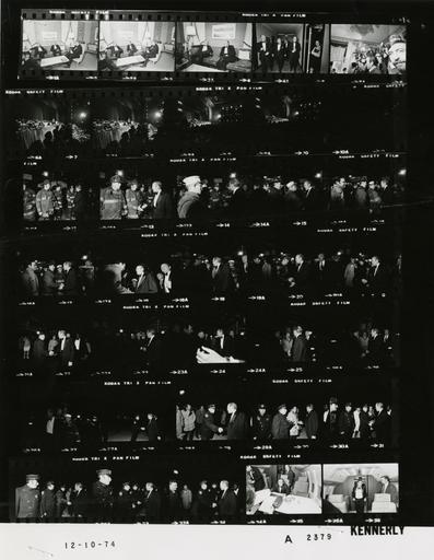 | Keywords: Ford A2379 NLGRF photo contact sheet (1974-12-10)(Gerald Ford Library).jpg White House Photographic Office WHPO is housed at the Gerald R Ford Presidential Library a branch of the National Archives and Records Administration NARA <br/><br/> This file is a 200 dpi photo contact sheet having images from roll of film A2379 of the August 9 1974 - January 20 1977 Gerald R Ford White House Photographic Office Series A0001-A9999 and B0001-B2886 photographs <br/><br/> The date on the photo contact sheet is the date the roll of film was processed not necessarily the date the photographs were taken See table below for additional details 1974-12-10 Gerald R Ford Presidential Library Image http //www fordlibrarymuseum gov/library/whphotos/A2379_NLGRF jpg A2379_NLGRF jpg from http //www fordlibrarymuseum gov/library/whphotos/19741210whpo pdf White House Photographs December 10 1974 of the http //www fordlibrarymuseum gov/Library/whphotos/whpo asp White House Photographic Collection page White House Photographic Office WHPO <br/> Creator David Hume Kennerly PD-USGov Institution Institution Gerald R Ford Presidential Library Table wikitable sortable + Photo contact sheet A2379 U S President Ford Administration Gerald R Ford Library Frame s Tone Subject proper Subject generic Names Geographic Location Photographer Date - 1A-3A BW Prior to National Football Foundation and Hall of Fame Awards Dinner - Chairman and President National Football Foundation and Hall of Fame Inc - New York City New York seated talking wearing tuxedos GRF Vincent Draddy Richard Kazmaier New York City NY Waldorf Astoria Hotel - President's Suite Kennerly 1974-12-10 - 4A BW Prior to National Football Foundation and Hall of Fame Awards Dinner - Chairman and President National Football Foundation and Hall of Fame Inc - New York City New York walking toward Ballroom GRF Vincent Draddy Richard Kazmaier Others New York City NY Waldorf Astoria Hotel - -Hallway Kennerly 1974-12-10 - 5A BW Prior to National Football Foundation and Hall of Fame Awards Dinner - New York City New York taking photos Photographers New York City NY Waldorf Astoria Hotel - Grand Ballroom Kennerly 1974-12-10 - 6A-9A BW National Football Foundation and Hall of Fame Awards Dinner - New York City New York GRF at podium speaking; others seated - all not in every frame GRF Platform Guest Others New York City NY Waldorf Astoria Hotel - Grand Ballroom Kennerly 1974-12-10 - 10A BW Kennerly 1974-12-10 - 11A-33A BW Prior to Departure for Kennedy International Airport - New York City New York greeting handshaking saying goodbye - all not in every frame GRF New York City Firemen Police Officers Officials New York City NY Wall Street Heliport Kennerly 1974-12-10 - 34A-35A BW Flight from Kennedy International Airport to Andrews Air Force Base working on plane - not in both frames Rumsfeld Zarb Others Air Force One Kennerly 1974-12-10 Gerald R Ford Presidential Library and Museum-cooperation PD-USGov Contact sheets by the Ford White House December 1974 Photographs by David Hume Kennerly from 1974 |