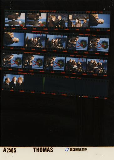 | Keywords: Ford A2505 NLGRF photo contact sheet (1974-12-17)(Gerald Ford Library).jpg White House Photographic Office WHPO is housed at the Gerald R Ford Presidential Library a branch of the National Archives and Records Administration NARA <br/><br/> This file is a 200 dpi photo contact sheet having images from roll of film A2505 of the August 9 1974 - January 20 1977 Gerald R Ford White House Photographic Office Series A0001-A9999 and B0001-B2886 photographs <br/><br/> The date on the photo contact sheet is the date the roll of film was processed not necessarily the date the photographs were taken See table below for additional details 1974-12-17 Gerald R Ford Presidential Library Image http //www fordlibrarymuseum gov/library/whphotos/A2505_NLGRF jpg A2505_NLGRF jpg from http //www fordlibrarymuseum gov/library/whphotos/19741217whpo pdf White House Photographs December 17 1974 of the http //www fordlibrarymuseum gov/Library/whphotos/whpo asp White House Photographic Collection page White House Photographic Office WHPO - Thomas PD-USGov Institution Institution Gerald R Ford Presidential Library Table wikitable sortable + Photo contact sheet A2505 U S President Ford Administration Gerald R Ford Library Frame s Tone Subject proper Subject generic Names Geographic Location Photographer Date - 3-4 Color Prior to the Christmas Pageant of Peace Ceremony; National Community Christmas Tree Lighting Ceremony greeting handshaking -only GRF in both frames GRF Platform Guests Washington DC Ellipse - Bandstand Thomas 1974-12-17 - 5 Color Prior to the Christmas Pageant of Peace Ceremony; National Community Christmas Tree Lighting Ceremony greeting handshaking GRF Sec Morton Washington DC Ellipse - Bandstand Thomas 1974-12-17 - 6 Color Prior to the Christmas Pageant of Peace Ceremony; National Community Christmas Tree Lighting Ceremony - Girl Scout Boy Scout standing talking GRF Camille Deppe James Williams Washington DC Ellipse - Bandstand Thomas 1974-12-17 - 7-8 Color Christmas Pageant of Peace Ceremony; National Community Christmas Tree Lighting Ceremony seated listening -close up left side profile GRF Washington DC Ellipse - Bandstand Thomas 1974-12-17 - 9-17 Color Christmas Pageant of Peace Ceremony; National Community Christmas Tree Lighting Ceremony seated talking - various angles GRF Sec Morton Camille Deppe James Williams Platform Guests Washington DC Ellipse - Bandstand Thomas 1974-12-17 - 18 Color Following Christmas Pageant of Peace Ceremony; National Community Christmas Tree Lighting Ceremony - Mayor of Washington DC standing talking GRF Mayor Washington Unidentified Man Washington DC Ellipse - Bandstand Thomas 1974-12-17 Gerald R Ford Presidential Library and Museum-cooperation PD-USGov Contact sheets by the Ford White House December 1974 |