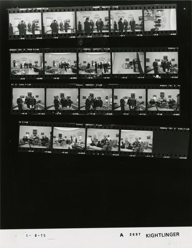 Keywords: Ford A2697 NLGRF photo contact sheet (1975-01-08)(Gerald Ford Library).jpg White House Photographic Office WHPO is housed at the Gerald R Ford Presidential Library a branch of the National Archives and Records Administration NARA <br/><br/> This file is a 200 dpi photo contact sheet having images from roll of film A2697 of the August 9 1974 - January 20 1977 Gerald R Ford White House Photographic Office Series A0001-A9999 and B0001-B2886 photographs <br/><br/> The date on the photo contact sheet is the date the roll of film was processed not necessarily the date the photographs were taken See table below for additional details 1975-01-08 Gerald R Ford Presidential Library Image http //www fordlibrarymuseum gov/library/whphotos/A2697_NLGRF jpg A2697_NLGRF jpg from http //www fordlibrarymuseum gov/library/whphotos/19750108whpo pdf White House Photographs January 8 1975 of the http //www fordlibrarymuseum gov/Library/whphotos/whpo asp White House Photographic Collection page White House Photographic Office WHPO - Kightlinger PD-USGov Institution Institution Gerald R Ford Presidential Library Table wikitable sortable + Photo contact sheet A2697 U S President Ford Administration Gerald R Ford Library Frame s Tone Subject proper Subject generic Names Geographic Location Photographer Date - 4-11 BW Interview with Washington Post Writers - Asst Managing Editor Rosenfeld ; White House Correspondent Kilpatrick ; National Correspondent Johnson ; News Staff Member Cannon ; Photographer Johnston greeting handshaking smiling walking toward fireplace -all not in every frame GRF Harry Rosenfeld Carroll Kilpatrick Haynes Johnson Lou Gannon Frank Johnston Oval Office Kightlinger 1975-01-08 - 12 BW Interview with Washington Post Writers standing near bookcase posing GRF Oval Office Kightlinger 1975-01-08 - 13-17 BW Interview with Washington Post Writers - Asst Managing Editor Rosenfeld ; White House Correspondent Kilpatrick ; National Correspondent Johnson ; News Staff Member Cannon ; Photographer Johnston standing talking near fireplace GRF Harry Rosenfeld Carroll Kilpatrick Haynes Johnson Lou Gannon Frank Johnston Oval Office Kightlinger 1975-01-08 - 18-22 BW Interview with Washington Post Writers - Asst Managing Editor Rosenfeld ; White House Correspondent Kilpatrick ; National Correspondent Johnson ; News Staff Member Cannon ; Photographer Johnston seated talking near fireplace GRF Harry Rosenfeld Carroll Kilpatrick Haynes Johnson Lou Gannon Frank Johnston Oval Office Kightlinger 1975-01-08 Gerald R Ford Presidential Library and Museum-cooperation PD-USGov Contact sheets by the Ford White House January 1975 |