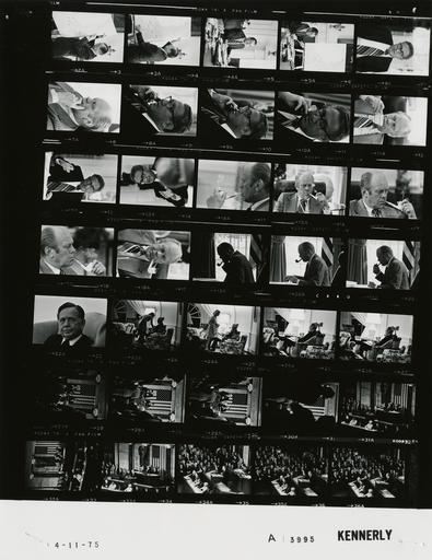 | Keywords: Ford A3995 NLGRF photo contact sheet (1975-04-09)(Gerald Ford Library).jpg White House Photographic Office WHPO is housed at the Gerald R Ford Presidential Library a branch of the National Archives and Records Administration NARA <br/><br/> This file is a 200 dpi photo contact sheet having images from roll of film A3995 of the August 9 1974 - January 20 1977 Gerald R Ford White House Photographic Office Series A0001-A9999 and B0001-B2886 photographs <br/><br/> The date on the photo contact sheet is the date the roll of film was processed not necessarily the date the photographs were taken See table below for additional details 1975-04-09 Gerald R Ford Presidential Library Image http //www fordlibrarymuseum gov/library/whphotos/A3995_NLGRF jpg A3995_NLGRF jpg from http //www fordlibrarymuseum gov/library/whphotos/19750409whpo pdf White House Photographs April 9 1975 of the http //www fordlibrarymuseum gov/Library/whphotos/whpo asp White House Photographic Collection page White House Photographic Office WHPO <br/> Creator David Hume Kennerly PD-USGov Institution Institution Gerald R Ford Presidential Library Table wikitable sortable + Photo contact sheet A3995 U S President Ford Administration Gerald R Ford Library Frame s Tone Subject proper Subject generic Names Geographic Location Photographer Date - 2A-5A BW National Security Council NSC Meeting standing pointing at chart in first two frames; seated at table Colby Cabinet Room Kennerly 1975-04-09 - 6A BW head and shoulder portrait s Kissinger Oval Office Kennerly 1975-04-10 - 7A BW head and shoulder profile portrait s ; hand on chin GRF Oval Office Kennerly 1975-04-10 - 8A-10A BW head and shoulder profile portrait s ; on telephone Kissinger Oval Office Kennerly 1975-04-10 - 11A BW close up; sipping coffee GRF Oval Office Kennerly 1975-04-10 - 12A-13A BW close up; gesturing Kissinger Oval Office Kennerly 1975-04-10 - 14A-21A BW smoking pipe; close up; silhouette on last three frames GRF Oval Office Kennerly 1975-04-10 - 22A BW head and shoulder portrait s Rep Albert Oval Office Kennerly 1975-04-10 - 23A-26A BW Prior to State of the World Address seated reading; smoking pipe glasses propped on forehead; Susan Ford in first two frames GRF Second Floor - West Sitting Hall Kennerly 1975-04-10 - 27A-30A BW Prior to State of the World Address various activities; all not in every frame; various angles and distances GRF Rockefeller Rep Albert Representatives Others Washington DC United States Capitol -House Floor Kennerly 1975-04-10 - 31A-36A BW State of the World Address GRF at podium; others seated; long shots from Gallery GRF Rockefeller Rep Albert Representatives Others Washington DC United States Capitol -House Floor Kennerly 1975-04-10 Gerald R Ford Presidential Library and Museum-cooperation PD-USGov Contact sheets by the Ford White House April 1975 Photographs by David Hume Kennerly from 1975 |