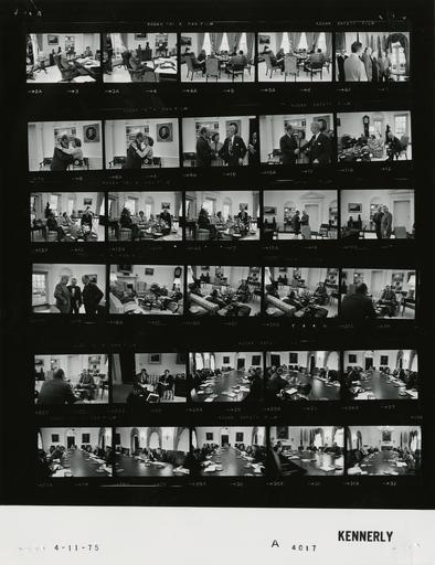 | Keywords: Ford A4017 NLGRF photo contact sheet (1975-04-11)(Gerald Ford Library).jpg White House Photographic Office WHPO is housed at the Gerald R Ford Presidential Library a branch of the National Archives and Records Administration NARA <br/><br/> This file is a 200 dpi photo contact sheet having images from roll of film A4017 of the August 9 1974 - January 20 1977 Gerald R Ford White House Photographic Office Series A0001-A9999 and B0001-B2886 photographs <br/><br/> The date on the photo contact sheet is the date the roll of film was processed not necessarily the date the photographs were taken See table below for additional details 1975-04-11 Gerald R Ford Presidential Library Image http //www fordlibrarymuseum gov/library/whphotos/A4017_NLGRF jpg A4017_NLGRF jpg from http //www fordlibrarymuseum gov/library/whphotos/19750411whpo pdf White House Photographs April 11 1975 of the http //www fordlibrarymuseum gov/Library/whphotos/whpo asp White House Photographic Collection page White House Photographic Office WHPO <br/> Creator David Hume Kennerly PD-USGov Institution Institution Gerald R Ford Presidential Library Table wikitable sortable + Photo contact sheet A4017 U S President Ford Administration Gerald R Ford Library Frame s Tone Subject proper Subject generic Names Geographic Location Photographer Date - 10-11 BW Ambassador-designate to Switzerland greeting handshaking GRF Amb Mrs Peter Dominick Oval Office Kennerly 1975-04-11 - 12-15 BW Ambassador-designate to Switzerland seated near fireplace; various angles GRF Amb Mrs Peter Dominick Oval Office Kennerly 1975-04-11 - 16-18 BW Director Federal Mediation and Conciliation Service greeting handshaking; Dunlop in last frame GRF William Usery Oval Office Kennerly 1975-04-11 - 19-23 BW Director Federal Mediation and Conciliation Service seated near fireplace; Dunlop not in last two frames GRF Dunlop Usery Oval Office Kennerly 1975-04-11 - 24 BW seated on sofa Cannon Unidentified Man Scheduling and Advance Office Kennerly 1975-04-11 - 25-32 BW Meeting to Discuss East Asian and Pacific Affairs around table; various angles and distances; all not in every frame GRF Kissinger Marsh Habib Schlesinger Brown Scowcroft Buchen Rumsfeld Cabinet Room Kennerly 1975-04-11 - 3-4 BW around desk; GRF leaning back in chair; listening GRF Nessen Oval Office Kennerly 1975-04-11 - 5-6 BW around desk GRF Nessen Rumsfeld Friedersdorf Marsh Hartmann Oval Office Kennerly 1975-04-11 - 7 BW Prior to Presentation of the Robert H Goddard Memorial Trophy standing; all not in frame GRF Col Gerald Carr Rep Teague Fred Everett John Frank William Dempsey James Fletcher John Yardley Cannon Raoul-Duval Cabinet Room Kennerly 1975-04-11 - 8-9 BW Wife of Ambassador-designate to Switzerland greeting embracing GRF Nancy Dominick Oval Office Kennerly 1975-04-11 Gerald R Ford Presidential Library and Museum-cooperation PD-USGov Contact sheets by the Ford White House April 1975 Photographs by David Hume Kennerly from 1975 |