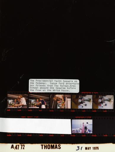 | Keywords: Ford A4772 NLGRF photo contact sheet (1975-05-31)(Gerald Ford Library).jpg  White House Photographic Office WHPO is housed at the Gerald R Ford Presidential Library a branch of the National Archives and Records Administration NARA <br/><br/> This file is a 200 dpi photo contact sheet having images from roll of film A4772 of the August 9 1974 - January 20 1977 Gerald R Ford White House Photographic Office Series A0001-A9999 and B0001-B2886 photographs <br/><br/> The date on the photo contact sheet is the date the roll of film was processed not necessarily the date the photographs were taken See table below for additional details 1975-05-31 Gerald R Ford Presidential Library Image http //www fordlibrarymuseum gov/library/whphotos/A4772_NLGRF jpg A4772_NLGRF jpg from http //www fordlibrarymuseum gov/library/whphotos/19750531whpo pdf White House Photographs May 31 1975 of the http //www fordlibrarymuseum gov/Library/whphotos/whpo asp White House Photographic Collection page White House Photographic Office WHPO - Thomas PD-USGov Institution Institution Gerald R Ford Presidential Library Table wikitable sortable + Photo contact sheet A4772 U S President Ford Administration Gerald R Ford Library Frame s Tone Subject proper Subject generic Names Geographic Location Photographer Date - 5A-7A Color Preparations for White House Prom Dinner Susan watching floral arranging for Prom dinner centerpiece Susan Ford White House Staff unidentified woman White House Kitchen Thomas 1975-05-31 - 8A-9A Color Touring White House prior to Prom seated standing around desk Susan Ford 2 unidentified females President's Private Office Thomas 1975-05-31 - 13A Color River Cruise Prior to Holton Arm's Senior Prom standing on bow or yacht; Susan pushing Susan Ford Billy Pifer USS Sequoia Thomas 1975-05-31 - 34A-37A Color Preparations for River Cruise Prior to Holton Arm's Senior Prom standing together on deck by railing Susan Ford Billy Pifer USS Sequoia Thomas 1975-05-31 - 10A-12A Color CLOSED TO RESEARCH Thomas 1975-05-31 Gerald R Ford Presidential Library and Museum-cooperation PD-USGov Contact sheets by the Ford White House May 1975 |