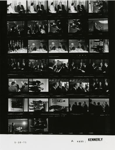 | Keywords: Ford A4835 NLGRF photo contact sheet (1975-05-30)(Gerald Ford Library).jpg White House Photographic Office WHPO is housed at the Gerald R Ford Presidential Library a branch of the National Archives and Records Administration NARA <br/><br/> This file is a 200 dpi photo contact sheet having images from roll of film A4835 of the August 9 1974 - January 20 1977 Gerald R Ford White House Photographic Office Series A0001-A9999 and B0001-B2886 photographs <br/><br/> The date on the photo contact sheet is the date the roll of film was processed not necessarily the date the photographs were taken See table below for additional details 1975-05-30 Gerald R Ford Presidential Library Image http //www fordlibrarymuseum gov/library/whphotos/A4835_NLGRF jpg A4835_NLGRF jpg from http //www fordlibrarymuseum gov/library/whphotos/19750530whpo pdf White House Photographs May 30 1975 of the http //www fordlibrarymuseum gov/Library/whphotos/whpo asp White House Photographic Collection page White House Photographic Office WHPO <br/> Creator David Hume Kennerly PD-USGov Institution Institution Gerald R Ford Presidential Library Table wikitable sortable + Photo contact sheet A4835 U S President Ford Administration Gerald R Ford Library Frame s Tone Subject proper Subject generic Names Geographic Location Photographer Date - 2A-4A BW Trip to Belgium -Following Meeting with Prime Minister of Great Britain coming out doorway; walking talking GRF Harold Wilson Brussels Belgium American Embassy Residence - Outside Kennerly 1975-05-30 - 5A-7A BW Trip to Belgium -Prior to NATO Ordinary Session standing talking; Luns in last frame GRF Others Brussels Belgium North Atlantic Treaty Organization NATO Headquarters - Conference Room I Kennerly 1975-05-30 - 8A BW Trip to Belgium -Prime Minister of Belgium standing talking Kissinger Leo Tindemans Brussels Belgium North Atlantic Treaty Organization NATO Headquarters Kennerly 1975-05-30 - 9A-10A BW Trip to Belgium -Luncheon Following NATO Ordinary Session in buffet line; close ups GRF Joseph Luns Brussels Belgium North Atlantic Treaty Organization NATO Headquarters Kennerly 1975-05-30 - 11A-17A BW Trip to Belgium -Luncheon Following NATO Ordinary Session seated talking; French Ambassador in first frame GRF Joseph Luns Brussels Belgium North Atlantic Treaty Organization NATO Headquarters Kennerly 1975-05-30 - 18A-20A BW Trip to Belgium -Luncheon Following NATO Ordinary Session seated talking Kissinger Unidentified Man Brussels Belgium North Atlantic Treaty Organization NATO Headquarters Kennerly 1975-05-30 - 21A BW Trip to Belgium -Prior to Meeting with Prime Minister of Canada walking talking GRF Pierre Trudeau Brussels Belgium North Atlantic Treaty Organization NATO Headquarters Kennerly 1975-05-30 - 22A-25A BW Trip to Belgium -Meeting with Prime Minister of Canada seated talking GRF Pierre Trudeau Brussels Belgium North Atlantic Treaty Organization NATO Headquarters - Secretary General's Conference Room Kennerly 1975-05-30 - 26A-31A BW Trip to Belgium -14th Press Conference GRF at podium speaking; various angles and distances GRF Media Brussels Belgium Brussels Sheraton Hotel - Press Center Kennerly 1975-05-30 Gerald R Ford Presidential Library and Museum-cooperation PD-USGov Contact sheets by the Ford White House May 1975 Photographs by David Hume Kennerly from 1975 |