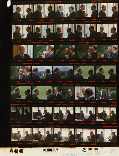 Keywords: Ford A4846 NLGRF photo contact sheet (1975-06-02)(Gerald Ford Library).jpg White House Photographic Office WHPO is housed at the Gerald R Ford Presidential Library a branch of the National Archives and Records Administration NARA <br/><br/> This file is a 200 dpi photo contact sheet having images from roll of film A4846 of the August 9 1974 - January 20 1977 Gerald R Ford White House Photographic Office Series A0001-A9999 and B0001-B2886 photographs <br/><br/> The date on the photo contact sheet is the date the roll of film was processed not necessarily the date the photographs were taken See table below for additional details 1975-06-02 Gerald R Ford Presidential Library Image http //www fordlibrarymuseum gov/library/whphotos/A4846_NLGRF jpg A4846_NLGRF jpg from http //www fordlibrarymuseum gov/library/whphotos/19750602whpo pdf White House Photographs June 2 1975 of the http //www fordlibrarymuseum gov/Library/whphotos/whpo asp White House Photographic Collection page White House Photographic Office WHPO <br/> Creator David Hume Kennerly PD-USGov Institution Institution Gerald R Ford Presidential Library Table wikitable sortable + Photo contact sheet A4846 U S President Ford Administration Gerald R Ford Library Frame s Tone Subject proper Subject generic Names Geographic Location Photographer Date - 3-12 Color Trip to Austria - Meeting with President of Egypt talking both gesturing in some frames; window in background; close ups; head and shoulder silhouette portrait s GRF Anwar Al-Sadat Salzburg Austria Hotel Schloss Klessheim Kennerly 1975-06-02 - 13 Color Trip to Austria - Meeting with President of Egypt head and shoulder portrait s ; stern expression GRF Salzburg Austria Hotel Schloss Klessheim Kennerly 1975-06-02 - 14 Color Trip to Austria - Meeting with President of Egypt lighting pipe; smoke obscuring Sadat GRF Salzburg Austria Hotel Schloss Klessheim Kennerly 1975-06-02 - 15-26 Color Trip to Austria - Meeting with President of Egypt talking; close ups; various angles and distances; backs to camera in most frames GRF Anwar Al-Sadat Salzburg Austria Hotel Schloss Klessheim -Grand Hall Patio Area Kennerly 1975-06-02 - 27 Color Trip to Austria - Meeting with President of Egypt walking talking Kissinger Sisco Salzburg Austria Hotel Schloss Klessheim -Grand Hall Patio Area Kennerly 1975-06-02 - 28-37 Color Trip to Austria - Meeting with President of Egypt seated talking window in background; both holding smoking pipes; smoke obscuring Sadat in last frame GRF Anwar Al-Sadat Salzburg Austria Hotel Schloss Klessheim Kennerly 1975-06-02 Gerald R Ford Presidential Library and Museum-cooperation PD-USGov Contact sheets by the Ford White House June 1975 Photographs by David Hume Kennerly from 1975 |