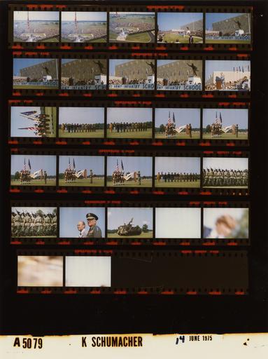 | Keywords: Ford A5079 NLGRF photo contact sheet (1975-06-14)(Gerald Ford Library).jpg White House Photographic Office WHPO is housed at the Gerald R Ford Presidential Library a branch of the National Archives and Records Administration NARA <br/><br/> This file is a 200 dpi photo contact sheet having images from roll of film A5079 of the August 9 1974 - January 20 1977 Gerald R Ford White House Photographic Office Series A0001-A9999 and B0001-B2886 photographs <br/><br/> The date on the photo contact sheet is the date the roll of film was processed not necessarily the date the photographs were taken See table below for additional details 1975-06-14 Gerald R Ford Presidential Library Image http //www fordlibrarymuseum gov/library/whphotos/A5079_NLGRF jpg A5079_NLGRF jpg from http //www fordlibrarymuseum gov/library/whphotos/19750614whpo pdf White House Photographs June 14 1975 of the http //www fordlibrarymuseum gov/Library/whphotos/whpo asp White House Photographic Collection page White House Photographic Office WHPO - Schumacher PD-USGov Institution Institution Gerald R Ford Presidential Library Table wikitable sortable + Photo contact sheet A5079 U S President Ford Administration Gerald R Ford Library Frame s Tone Subject proper Subject generic Names Geographic Location Photographer Date - 15-27 Color Trip to Georgia - 200th Anniversary of the U S Army Infantry - Columbus Georgia no subject Columbus GA Fort Benning -York Field Schumacher 1975-06-14 - 2-4 Color Trip to Georgia - 200th Anniversary of the U S Army Infantry - Columbus Georgia long shots from roof of Infantry Hall Columbus GA Fort Benning -York Field Schumacher 1975-06-14 - 5-11 Color Trip to Georgia - 200th Anniversary of the U S Army Infantry - Columbus Georgia GRF speaking at podium; infantryman statue in background; various angles and distances; all not in every frame GRF Maj Gen Tarpley Guests Crowd Columbus GA Fort Benning -Reviewing Stand Schumacher 1975-06-14 - 12 Color Trip to Georgia - 200th Anniversary of the U S Army Infantry - Columbus Georgia dressed in colonial uniforms Color Guard Columbus GA Fort Benning -York Field Schumacher 1975-06-14 - 13-14 Color Trip to Georgia - 200th Anniversary of the U S Army Infantry - Columbus Georgia dressed in uniforms marking key periods in Army history U S Army Soldiers Columbus GA Fort Benning -York Field Schumacher 1975-06-14 - 15-19 Color Trip to Georgia - 200th Anniversary of the U S Army Infantry - Columbus Georgia dressed in colonial uniforms; Officer in modern uniform; attaching new ribbon to flag standard Color Guard; Officer Columbus GA Fort Benning -York Field Schumacher 1975-06-14 - 20 Color Trip to Georgia - 200th Anniversary of the U S Army Infantry - Columbus Georgia dressed in uniforms marking key periods in Army history U S Army Soldiers Columbus GA Fort Benning -York Field Schumacher 1975-06-14 - 21-22 Color Trip to Georgia - 200th Anniversary of the U S Army Infantry - Columbus Georgia marching in review Army Rangers Columbus GA Fort Benning -York Field Schumacher 1975-06-14 - 23 Color Trip to Georgia - 200th Anniversary of the U S Army Infantry - Columbus Georgia standing watching review; close up GRF Army Officer Columbus GA Fort Benning -York Field Schumacher 1975-06-14 - 24 Color Trip to Georgia - 200th Anniversary of the U S Army Infantry - Columbus Georgia Armored Personnel Carrier in action Columbus GA Fort Benning -York Field Schumacher 1975-06-14 Gerald R Ford Presidential Library and Museum-cooperation PD-USGov Contact sheets by the Ford White House June 1975 |