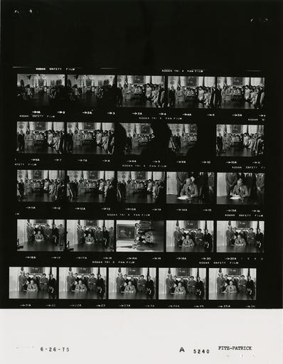 | Keywords: Ford A5240 NLGRF photo contact sheet (1975-06-26)(Gerald Ford Library).jpg White House Photographic Office WHPO is housed at the Gerald R Ford Presidential Library a branch of the National Archives and Records Administration NARA <br/><br/> This file is a 200 dpi photo contact sheet having images from roll of film A5240 of the August 9 1974 - January 20 1977 Gerald R Ford White House Photographic Office Series A0001-A9999 and B0001-B2886 photographs <br/><br/> The date on the photo contact sheet is the date the roll of film was processed not necessarily the date the photographs were taken See table below for additional details 1975-06-26 Gerald R Ford Presidential Library Image http //www fordlibrarymuseum gov/library/whphotos/A5240_NLGRF jpg A5240_NLGRF jpg from http //www fordlibrarymuseum gov/library/whphotos/19750626whpo pdf White House Photographs June 26 1975 of the http //www fordlibrarymuseum gov/Library/whphotos/whpo asp White House Photographic Collection page White House Photographic Office WHPO - Fitz-Patrick PD-USGov Institution Institution Gerald R Ford Presidential Library Table wikitable sortable + Photo contact sheet A5240 U S President Ford Administration Gerald R Ford Library Frame s Tone Subject proper Subject generic Names Geographic Location Photographer Date - 1A-13A BW Meeting with Young Men's Christian Association's YMCA Youth Governors Conference Participants standing around table; GRF speaking taken along length of table; all not in frames GRF YMCA Youths Cabinet Room Fitz-Patrick 1975-06-26 - 14A-15A BW Prior to Signing The Uranium Enrichment Message to Congress seated at table speaking; close up GRF Cabinet Room Fitz-Patrick 1975-06-26 - 16A-25A BW Prior to Signing The Uranium Enrichment Message to Congress GRF seated others standing behind; signing in 6 frames GRF Rep Anderson Zarb Hill Seamans Fri Lagrassie Cabinet Room Fitz-Patrick 1975-06-26 Gerald R Ford Presidential Library and Museum-cooperation PD-USGov Contact sheets by the Ford White House June 1975 |