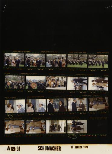 | Keywords: Ford A8991 NLGRF photo contact sheet (1976-03-30)(Gerald Ford Library).jpg White House Photographic Office WHPO is housed at the Gerald R Ford Presidential Library a branch of the National Archives and Records Administration NARA <br/><br/> This file is a 200 dpi photo contact sheet having images from roll of film A8991 of the August 9 1974 - January 20 1977 Gerald R Ford White House Photographic Office Series A0001-A9999 and B0001-B2886 photographs <br/><br/> The date on the photo contact sheet is the date the roll of film was processed not necessarily the date the photographs were taken See table below for additional details 1976-03-30 Gerald R Ford Presidential Library Image http //www fordlibrarymuseum gov/library/whphotos/A8991_NLGRF jpg A8991_NLGRF jpg from http //www fordlibrarymuseum gov/library/whphotos/19760330whpo pdf White House Photographs March 30 1976 of the http //www fordlibrarymuseum gov/Library/whphotos/whpo asp White House Photographic Collection page White House Photographic Office WHPO - Schumacher PD-USGov Institution Institution Gerald R Ford Presidential Library Table wikitable sortable + Photo contact sheet A8991 U S President Ford Administration Gerald R Ford Library Frame s Tone Subject proper Subject generic Names Geographic Location Photographer Date - 2-3 Color State Visit of Jordan's King Hussein I and Queen Alia-Arrival Ceremony standing waiting for limousine GRF Betty Ford South Driveway Schumacher 1976-03-30 - 4 Color State Visit of Jordan's King Hussein I and Queen Alia-Arrival Ceremony handshaking exiting limousine; BF holding roses GRF King Hussein Betty Ford South Driveway Schumacher 1976-03-30 - 5-8 Color State Visit of Jordan's King Hussein I and Queen Alia-Arrival Ceremony; US Marine Drum and Bugle Corps marching on grass close up of logo printed on drum U S Marine Drum Bugle Corps South Lawn Schumacher 1976-03-30 - 9 Color State Visit of Jordan's King Hussein I and Queen Alia-Arrival Ceremony standing watching Crowd South Entrance Schumacher 1976-03-30 - 10-11 Color State Visit of Jordan's King Hussein I and Queen Alia-Arrival Ceremony couples walking together GRF Queen Alia; Betty Ford King Hussein South Driveway Schumacher 1976-03-30 - 12-13 Color State Visit of Jordan's King Hussein I and Queen Alia-Arrival Reception standing talking smiling Betty Ford Queen Alia Blue Room Schumacher 1976-03-30 - 14-15 Color State Visit of Jordan's King Hussein I and Queen Alia-Arrival Reception standing talking smiling GRF King Hussein Blue Room Schumacher 1976-03-30 - 16-18 Color State Visit of Jordan's King Hussein I and Queen Alia-Arrival Reception standing talking smiling; Aide not in frame 16 Betty Ford Queen Alia Queen's Aide Blue Room Schumacher 1976-03-30 - 19-20 Color State Visit of Jordan's King Hussein I and Queen Alia-Oval Office Meeting walking together to Oval Office GRF King Hussein; Bob Barrett; Others Colonnade Schumacher 1976-03-30 Gerald R Ford Presidential Library and Museum-cooperation PD-USGov Contact sheets by the Ford White House March 1976 |