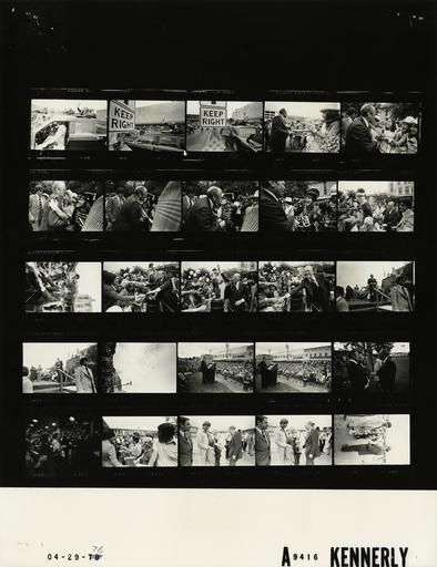 Keywords: Ford A9416 NLGRF photo contact sheet (1976-04-29)(Gerald Ford Library).jpg White House Photographic Office WHPO is housed at the Gerald R Ford Presidential Library a branch of the National Archives and Records Administration NARA <br/><br/> This file is a 200 dpi photo contact sheet having images from roll of film A9416 of the August 9 1974 - January 20 1977 Gerald R Ford White House Photographic Office Series A0001-A9999 and B0001-B2886 photographs <br/><br/> The date on the photo contact sheet is the date the roll of film was processed not necessarily the date the photographs were taken See table below for additional details 1976-04-29 Gerald R Ford Presidential Library Image http //www fordlibrarymuseum gov/library/whphotos/A9416_NLGRF jpg A9416_NLGRF jpg from http //www fordlibrarymuseum gov/library/whphotos/19760429whpo pdf White House Photographs April 29 1976 of the http //www fordlibrarymuseum gov/Library/whphotos/whpo asp White House Photographic Collection page White House Photographic Office WHPO <br/> Creator David Hume Kennerly PD-USGov Institution Institution Gerald R Ford Presidential Library Table wikitable sortable + Photo contact sheet A9416 U S President Ford Administration Gerald R Ford Library Frame s Tone Subject proper Subject generic Names Geographic Location Photographer Date - 2-4 BW Primary Campaign Trip to Texas-Parade in Honor of GRF Unveiling Ceremony for Montgomery County Texas War Memorial Park GRF Tower standing in sunroof waving to crowd limousine driving past Keep Right sign GRF Sen John Tower Crowd Conroe TX streets of Conroe Kennerly 1976-04-29 - 5-15 BW Primary Campaign Trip to Texas-Unveiling Ceremony for Montgomery County Texas War Memorial Park-Arriving for GRF working crowd at rope; kissing girls in cowgirl and majorette costumes waving reaching GRF girls Crowd Secret Service Conroe TX Montgomery County Texas War Memorial Park Kennerly 1976-04-29 - 12-16 BW Primary Campaign Trip to Texas-Unveiling Ceremony for Montgomery County Texas War Memorial Park-Remarks GRF at podium; various angles and distances; balloons rising in frame 14 GRF Crowd Secret Service Conroe TX Montgomery County Texas War Memorial Park Kennerly 1976-04-29 - 17-18 BW Primary Campaign Trip to Texas-Reception for PFC Staff Volunteers and Families handshaking outside while arriving and departing; handshaking indoors at reception GRF Crowd Staff Conroe TX Outside and Inside Holiday Inn Kennerly 1976-04-29 - 19-22 BW Primary Campaign Trip to Texas-Airport Departure GRF greets family on tarmac; 24-25 Mosbacher stands by GRF Unidentified Family Robert Mosbacher Houston TX Houston Intercontinental Airport Kennerly 1976-04-29 Gerald R Ford Presidential Library and Museum-cooperation PD-USGov Contact sheets by the Ford White House April 1976 Photographs by David Hume Kennerly from 1976