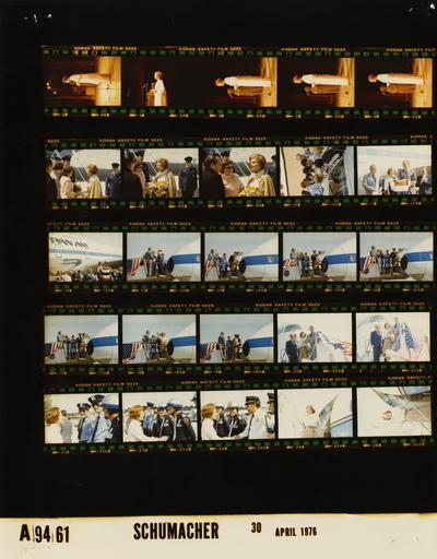 | Keywords: Ford A9461 NLGRF photo contact sheet (1976-04-29)(Gerald Ford Library).jpg White House Photographic Office WHPO is housed at the Gerald R Ford Presidential Library a branch of the National Archives and Records Administration NARA <br/><br/> This file is a 200 dpi photo contact sheet having images from roll of film A9461 of the August 9 1974 - January 20 1977 Gerald R Ford White House Photographic Office Series A0001-A9999 and B0001-B2886 photographs <br/><br/> The date on the photo contact sheet is the date the roll of film was processed not necessarily the date the photographs were taken See table below for additional details 1976-04-29 Gerald R Ford Presidential Library Image http //www fordlibrarymuseum gov/library/whphotos/A9461_NLGRF jpg A9461_NLGRF jpg from http //www fordlibrarymuseum gov/library/whphotos/19760429whpo pdf White House Photographs April 29 1976 of the http //www fordlibrarymuseum gov/Library/whphotos/whpo asp White House Photographic Collection page White House Photographic Office WHPO - Schumacher PD-USGov Institution Institution Gerald R Ford Presidential Library Table wikitable sortable + Photo contact sheet A9461 U S President Ford Administration Gerald R Ford Library Frame s Tone Subject proper Subject generic Names Geographic Location Photographer Date - 2 Color Betty Ford Trip to New York- 1600 Pennsylvania Avenue Performance to Benefit Lyndon B Johnson LBJ Grove in Washington; former First Lady standing onstage speaking at microphone; Parness behind Lady Bird Johnson; Chairwoman Molly Parness New York NY Mark Hellinger Theatre Schumacher 1976-04-29 - 3-6 Color Betty Ford Trip to New York- 1600 Pennsylvania Avenue Performance to Benefit Lyndon B Johnson LBJ Grove in Washington-First Lady Remarks; formal wear standing onstage speaking at microphone; Parness behind Betty Ford; Chairwoman Molly Parness New York NY Mark Hellinger Theatre Schumacher 1976-04-29 - 7A-9A Color Betty Ford Trip to Indianapolis Indiana - Prior to Christening of Pan-Am 747SP Liberty Bell at Weir Cook Field greeting handshaking standing talking at base of steps to Pan-Am 747SP Liberty Bell ; BF holding bouquet Betty Ford Others Indianapolis IN Weir Cook Field Schumacher 1976-04-30 - 10 Color Betty Ford Trip to Indianapolis Indiana - Arrival at Weir Cook FieldChristening of Pan-Am 747SP Liberty Bell at Weir Cook Field BF talking to Weidenfeld near open door to limousine; others in background Betty Ford Weidenfeld Secret Service Others Indianapolis IN Weir Cook Field Schumacher 1976-04-30 - 11-12 Color Betty Ford Trip to Indianapolis Indiana - Christening of Pan-Am 747SP Liberty Bell at Weir Cook Field BF at lectern speaking; Pan-Am 747SP Liberty Bell in background Betty Ford Others Indianapolis IN Weir Cook Field Schumacher 1976-04-30 - 13-20 Color Betty Ford Trip to Indianapolis Indiana - Christening of Pan-Am 747SP Liberty Bell at Weir Cook Field standing on platform at nose of Pan-Am 747SP Liberty Bell ; BF pouring liquid on nose of plane Betty Ford Others Indianapolis IN Weir Cook Field Schumacher 1976-04-30 - 22-24 Color Betty Ford Trip to Indianapolis Indiana - Prior to Departure for Andrews Air Force Base handshaking saying goodbye; all not in every frame Betty Ford Police Officers Indianapolis IN Weir Cook Field Schumacher 1976-04-30 - 25-26 Color Betty Ford Trip to Indianapolis Indiana - Prior to Departure for Andrews Air Force Base standing at top of steps in door of C-9 Aircraft Betty Ford Indianapolis IN Weir Cook Field Schumacher 1976-04-30 Gerald R Ford Presidential Library and Museum-cooperation PD-USGov Contact sheets by the Ford White House April 1976 |