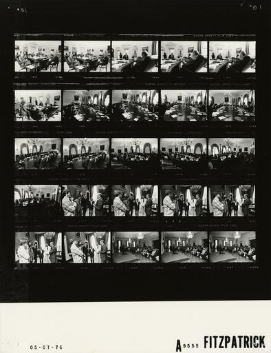 Keywords: Ford A9555 NLGRF photo contact sheet (1976-05-06)(Gerald Ford Library).jpg White House Photographic Office WHPO is housed at the Gerald R Ford Presidential Library a branch of the National Archives and Records Administration NARA <br/><br/> This file is a 200 dpi photo contact sheet having images from roll of film A9555 of the August 9 1974 - January 20 1977 Gerald R Ford White House Photographic Office Series A0001-A9999 and B0001-B2886 photographs <br/><br/> The date on the photo contact sheet is the date the roll of film was processed not necessarily the date the photographs were taken See table below for additional details 1976-05-06 Gerald R Ford Presidential Library Image http //www fordlibrarymuseum gov/library/whphotos/A9555_NLGRF jpg A9555_NLGRF jpg from http //www fordlibrarymuseum gov/library/whphotos/19760506whpo pdf White House Photographs May 6 1976 of the http //www fordlibrarymuseum gov/Library/whphotos/whpo asp White House Photographic Collection page White House Photographic Office WHPO - Fitz-Patrick PD-USGov Institution Institution Gerald R Ford Presidential Library Table wikitable sortable + Photo contact sheet A9555 U S President Ford Administration Gerald R Ford Library Frame s Tone Subject proper Subject generic Names Geographic Location Photographer Date - 3-8 BW Meeting with California Finance Chairman for PFC and President of Carter Hawley Hale Department Stores Los Angeles seated around desk; Cheney in 3 frames; Carter and GRF together in 3 frames GRF Edward W Carter; Cheney Oval Office Fitz-Patrick 1976-05-06 - 9-18 BW Meeting to Discuss Social Security Long-Range Financing seated around table both sides shown GRF Buchen Lazarus Friedersdorf Seidman Cannon Quern Moore Lynn O'Neill Greenspan Malkiel Mathews Wm A Morrill Ronald L Davis Usery Henry Perritt George Dixon James Van Horne David Ranson James Baker Cabinet Room Fitz-Patrick 1976-05-06 - 19-24 BW Reception for Members of the Association of American Editorial Cartoonists-Meeting with AAEC Pres Hill; AAEC VP Warren; AAEC Secy-Treas Jurden; AAEC Director MacNelley standing talking GRF Draper Hill Thomas Curtis L D Warren Jack Jurden Jeff MacNelley Red Room Fitz-Patrick 1976-05-06 - 25-27 BW Reception for Members of the Association of American Editorial Cartoonists-GRF Remarks GRF at podium guests seated GRF Guests State Dining Room Fitz-Patrick 1976-05-06 Gerald R Ford Presidential Library and Museum-cooperation PD-USGov Contact sheets by the Ford White House May 1976 |