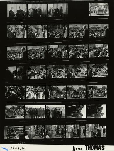 Keywords: Ford A9750 NLGRF photo contact sheet (1976-05-12)(Gerald Ford Library).jpg White House Photographic Office WHPO is housed at the Gerald R Ford Presidential Library a branch of the National Archives and Records Administration NARA <br/><br/> This file is a 200 dpi photo contact sheet having images from roll of film A9750 of the August 9 1974 - January 20 1977 Gerald R Ford White House Photographic Office Series A0001-A9999 and B0001-B2886 photographs <br/><br/> The date on the photo contact sheet is the date the roll of film was processed not necessarily the date the photographs were taken See table below for additional details 1976-05-12 Gerald R Ford Presidential Library Image http //www fordlibrarymuseum gov/library/whphotos/A9750_NLGRF jpg A9750_NLGRF jpg from http //www fordlibrarymuseum gov/library/whphotos/19760512whpo pdf White House Photographs May 12 1976 of the http //www fordlibrarymuseum gov/Library/whphotos/whpo asp White House Photographic Collection page White House Photographic Office WHPO - Thomas PD-USGov Institution Institution Gerald R Ford Presidential Library Table wikitable sortable + Photo contact sheet A9750 U S President Ford Administration Gerald R Ford Library Frame s Tone Subject proper Subject generic Names Geographic Location Photographer Date - 3-5 BW Primary Campaign Trip to Michigan-Remarks to Economic Club of Detroit-departing from; Econ Club Pres Swaney and Chairman MacDonald; US Senator Representative and Governor of Michigan MI standing onstage applauding departing; all may not be shown GRF Russ Swaney Ray MacDonald Sen Robert Griffin Rep Elford Cederberg Rev H Coleman McGehee Gov William Millikin Bloomfield Hills MI Roma Hall Thomas 1976-05-12 - 6 BW Primary Campaign Trip to Michigan- Thomas 1976-05-12 - 7 BW Primary Campaign Trip to Michigan-Motorcade enroute to Shain Park GRF waving from sunroof of limousine GRF motorcade Secret Service Crowd Bloomfield Hills MI Streets of Bloomfield Hills MI Thomas 1976-05-12 - 8-9 BW Primary Campaign Trip to Michigan-Shain Park Campaign Rally talking outdoors; head and shoulders profiles GRF former MI Gov George Romney Birmingham MI Shain Park Thomas 1976-05-12 - 10-14 BW Primary Campaign Trip to Michigan-Shain Park Campaign Rally-GRF Remarks GRF in profile speaking into microphone crowd to left GRF Crowd Birmingham MI Shain Park Thomas 1976-05-12 - 15-24 BW Primary Campaign Trip to Michigan-Shain Park Campaign Rally-Departing GRF working crowd GRF Crowd Birmingham MI Shain Park Thomas 1976-05-12 - 25-28 BW Primary Campaign Trip to Michigan-Shain Park Campaign Rally-Motorcade GRF waving from limo sunroof USS walking alongside limo and crowd GRF Crowd Secret Service limousine 226 2000 Birmingham MI Streets of Birmingham Thomas 1976-05-12 - 29-37 BW Primary Campaign Trip to Michigan; Tour of Ford Van Dyke Auto Chassis Plant; Ford Motor Company President Iacocca; Plant Manager Harris - Sterling Heights Michigan walking as group; GRF and Iacocca walking talking; handshaking; all may not be shown; GRF standing with Harris and w/plant worker talking viewing apparatus; various venues; all not in every frame GRF Lee Iacocca; Thomas Harris Raymond Logue Rodney Markley Will Scott Walter Murphy Sterling Heights MI Ford Van Dyke Chassis Plant Thomas 1976-05-12 Gerald R Ford Presidential Library and Museum-cooperation PD-USGov Contact sheets by the Ford White House May 1976 |
