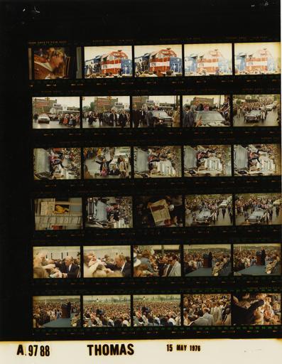 Keywords: Ford A9788 NLGRF photo contact sheet (1976-05-15)(Gerald Ford Library).jpg White House Photographic Office WHPO is housed at the Gerald R Ford Presidential Library a branch of the National Archives and Records Administration NARA <br/><br/> This file is a 200 dpi photo contact sheet having images from roll of film A9788 of the August 9 1974 - January 20 1977 Gerald R Ford White House Photographic Office Series A0001-A9999 and B0001-B2886 photographs <br/><br/> The date on the photo contact sheet is the date the roll of film was processed not necessarily the date the photographs were taken See table below for additional details 1976-05-15 Gerald R Ford Presidential Library Image http //www fordlibrarymuseum gov/library/whphotos/A9788_NLGRF jpg A9788_NLGRF jpg from http //www fordlibrarymuseum gov/library/whphotos/19760515whpo pdf White House Photographs May 15 1976 of the http //www fordlibrarymuseum gov/Library/whphotos/whpo asp White House Photographic Collection page White House Photographic Office WHPO - Thomas PD-USGov Institution Institution Gerald R Ford Presidential Library Table wikitable sortable + Photo contact sheet A9788 U S President Ford Administration Gerald R Ford Library Frame s Tone Subject proper Subject generic Names Geographic Location Photographer Date - 4 Color Primary Campaign Whistle-Stop Tour of Michigan-Flint close up profile wearing conductor's cap Cavaney Flint MI Train Station Thomas 1976-05-15 - 5-8 Color Primary Campaign Whistle-Stop Tour of Michigan-Boarding for Kalamazoo to Niles; US Representative from St Joseph Michigan MI standing on side ramp of red white and blue stars and stripes train 1776 GRF waving from window GRF Rep Edward Hutchinson Secret Service Crowd Niles MI Train Station Thomas 1976-05-15 - 9-18 Color Primary Campaign Whistle-Stop Tour of Michigan; 47th Annual Tulip Time Festival Parade; US Representative from Michigan MI Fords and Vander Jagt waving from sunroof; USSS walking with limo; street dancers in Dutch costumes Holland Rusk Bakery sign; Betty in pink and white polka dot outfit GRF Betty Ford Rep Guy Vander Jagt; Secret Service Dancers Crowd Holland MI Streets of Holland Thomas 1976-05-15 - 19 Color Primary Campaign Whistle-Stop Tour of Michigan-47th Annual Tulip Time Festival Parade waving from window holding Carter is Peanuts sign Unidentified Young man Holland MI Streets of Holland Thomas 1976-05-15 - 20 Color Primary Campaign Whistle-Stop Tour of Michigan; 47th Annual Tulip Time Festival Parade; US Representative from Michigan MI Fords and Vander Jagt waving from sunroof; USSS walking with limo; street dancers in Dutch costumes; Betty in pink and white polka dot outfit GRF Betty Ford Rep Guy Vander Jagt; Secret Service Dancers Crowd Holland MI Streets of Holland Thomas 1976-05-15 - 21 Color Primary Campaign Whistle-Stop Tour of Michigan-47th Annual Tulip Time Festival Parade girl in Dutch costume holding Welcome to Michigan President Ford sign Young Girl Holland MI Streets of Holland Thomas 1976-05-15 - 22-23 Color Primary Campaign Whistle-Stop Tour of Michigan; 47th Annual Tulip Time Festival Parade; US Representative from Michigan MI Fords and Vander Jagt waving from sunroof; Susan sitting on top of car waving; USSS walking with limo; Betty in pink and white polka dot outfit GRF Betty Ford Susan Ford Rep Guy Vander Jagt; Secret Service Crowd Holland MI Streets of Holland Thomas 1976-05-15 - 24-26 Color Primary Campaign Whistle-Stop Tour of Michigan; Airport Arrival - Saginaw Michigan handshaking at rope GRF Crowd Saginaw MI Tri-City Airport Thomas 1976-05-16 - 27-31 Color Primary Campaign Whistle-Stop Tour of Michigan; Saginaw Township Bicentennial Celebration; GRF Remarks - Saginaw Michigan GRF at podium Betty in brown and white eagle dress GRF Betty Ford Crowd Platform Guests Secret Service Saginaw MI Sherwood Elementary School Thomas 1976-05-16 - 32-33 Color Primary Campaign Whistle-Stop Tour of Michigan; Departing from Saginaw Township Bicentennial Celebration - Saginaw Michigan GRF handshaking at rope waving GRF Crowd Secret Service Saginaw MI Sherwood Elementary School Thomas 1976-05-16 Gerald R Ford Presidential Library and Museum-cooperation PD-USGov Contact sheets by the Ford White House May 1976 |