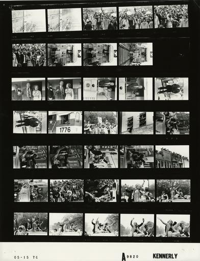 Keywords: Ford A9820 NLGRF photo contact sheet (1976-05-15)(Gerald Ford Library).jpg White House Photographic Office WHPO is housed at the Gerald R Ford Presidential Library a branch of the National Archives and Records Administration NARA <br/><br/> This file is a 200 dpi photo contact sheet having images from roll of film A9820 of the August 9 1974 - January 20 1977 Gerald R Ford White House Photographic Office Series A0001-A9999 and B0001-B2886 photographs <br/><br/> The date on the photo contact sheet is the date the roll of film was processed not necessarily the date the photographs were taken See table below for additional details 1976-05-15 Gerald R Ford Presidential Library Image http //www fordlibrarymuseum gov/library/whphotos/A9820_NLGRF jpg A9820_NLGRF jpg from http //www fordlibrarymuseum gov/library/whphotos/19760515whpo pdf White House Photographs May 15 1976 of the http //www fordlibrarymuseum gov/Library/whphotos/whpo asp White House Photographic Collection page White House Photographic Office WHPO <br/> Creator David Hume Kennerly PD-USGov Institution Institution Gerald R Ford Presidential Library Table wikitable sortable + Photo contact sheet A9820 U S President Ford Administration Gerald R Ford Library Frame s Tone Subject proper Subject generic Names Geographic Location Photographer Date - 2-15 BW Primary Campaign Whistle-Stop Tour of Michigan-Kalamazoo Remarks GRF/BF walking through crowd standing on caboose; GRF making remarks GRF Betty Ford Secret Service Others Crowd Kalamazoo MI Train Station Kennerly 1976-05-15 - 16-17 BW Primary Campaign Whistle-Stop Tour of Michigan-Kalamazoo Stopover standing on pavement Secret Service Kalamazoo MI Train Station Kennerly 1976-05-15 - 18-20 BW Primary Campaign Whistle-Stop Tour of Michigan GRF seated in train window; crowd with sigh Niles Welcomes the Titanic GRF Crowd Niles MI Train Station Kennerly 1976-05-15 - 21-36 BW Primary Campaign Whistle-Stop Tour of Michigan; 47th Annual Tulip Time Festival Parade; US Representative from Michigan MI BF/GRF waving from sunroof; people on rooftops and on curb; GRF/SF/BF waving from sunroof GRF Betty Ford Secret Service Crowd Rep Guy Vander Jagt Holland MI Streets of Holland Kennerly 1976-05-15 Gerald R Ford Presidential Library and Museum-cooperation PD-USGov Contact sheets by the Ford White House May 1976 Photographs by David Hume Kennerly from 1976 |