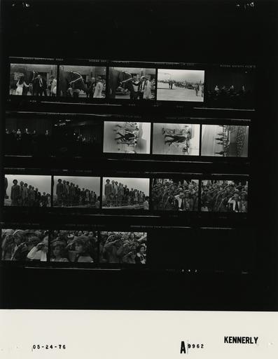 | Keywords: Ford A9962 NLGRF photo contact sheet (1976-05-24)(Gerald Ford Library).jpg White House Photographic Office WHPO is housed at the Gerald R Ford Presidential Library a branch of the National Archives and Records Administration NARA <br/><br/> This file is a 200 dpi photo contact sheet having images from roll of film A9962 of the August 9 1974 - January 20 1977 Gerald R Ford White House Photographic Office Series A0001-A9999 and B0001-B2886 photographs <br/><br/> The date on the photo contact sheet is the date the roll of film was processed not necessarily the date the photographs were taken See table below for additional details 1976-05-24 Gerald R Ford Presidential Library Image http //www fordlibrarymuseum gov/library/whphotos/A9962_NLGRF jpg A9962_NLGRF jpg from http //www fordlibrarymuseum gov/library/whphotos/19760524whpo pdf White House Photographs May 24 1976 of the http //www fordlibrarymuseum gov/Library/whphotos/whpo asp White House Photographic Collection page White House Photographic Office WHPO <br/> Creator David Hume Kennerly PD-USGov Institution Institution Gerald R Ford Presidential Library Table wikitable sortable + Photo contact sheet A9962 U S President Ford Administration Gerald R Ford Library Frame s Tone Subject proper Subject generic Names Geographic Location Photographer Date - 2A-4A BW Trip to California; PFC Breakfast Reception - Laguna Hills California GRF standing outside in parking lot petting elephant wearing President Ford '76 sign talking to trainers handshaking GRF elephant elephant trainers Laguna Hills CA Hilton Hotel - Exterior Kennerly 1976-05-24 - 5A BW Trip to Nevada; Motorcade to MGM Grand Hotel - Las Vegas Nevada motorcade departs airport Two limousines Secret Service Las Vegas NV McCarran Field Kennerly 1976-05-24 - 6A-8A BW Trip to California-San Diego Chapter of Navy League and San Diego Chamber of Commerce Reception/Forum-Remarks; CofC Pres Jones Navy League Pres Stoecklein Navy Leage Women's Council Pres Burt San Diego Mayor introducing GRF; GRF at podium GRF Mayor Pete Wilson Mrs Vangie Burt US Rep Bob Wilson; Rear Adm Herbert Stoecklein Evan V Jones California Atty Gen Evelle Younger San Diego CA El Cortez Convention Center Kennerly 1976-05-24 - 9A-11A BW Trip to California-Airport Departure walking quickly on tarmac through hangar GRF Secret Service San Diego CA Lindbergh Field Kennerly 1976-05-24 - 12A-14A BW Trip to California; Van Nuys Campaign Rally -Van Nuys California standing in line on platform hands over hearts; all may not be shown GRF Lithgow Sue Kelley Ted Pierce Johnny Grant Alice Ogle Rosemary Ferraro Hon Mrs Evelle Younger Rep Barry Goldwater Paul Priolo Leon Parma Van Nuys CA Van Nuys Airport Kennerly 1976-05-24 - 15A-19A BW Trip to California; Van Nuys Campaign Rally; Scouts -Van Nuys California standing in crowd saluting Boy Scouts Cub Scouts Girls Others Van Nuys CA Van Nuys Airport Kennerly 1976-05-24 Gerald R Ford Presidential Library and Museum-cooperation PD-USGov Contact sheets by the Ford White House May 1976 Photographs by David Hume Kennerly from 1976 |