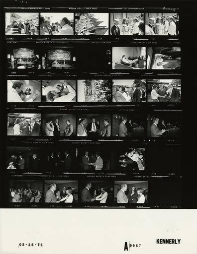Keywords: Ford A9967 NLGRF photo contact sheet (1976-05-24)(Gerald Ford Library).jpg White House Photographic Office WHPO is housed at the Gerald R Ford Presidential Library a branch of the National Archives and Records Administration NARA <br/><br/> This file is a 200 dpi photo contact sheet having images from roll of film A9967 of the August 9 1974 - January 20 1977 Gerald R Ford White House Photographic Office Series A0001-A9999 and B0001-B2886 photographs <br/><br/> The date on the photo contact sheet is the date the roll of film was processed not necessarily the date the photographs were taken See table below for additional details 1976-05-24 Gerald R Ford Presidential Library Image http //www fordlibrarymuseum gov/library/whphotos/A9967_NLGRF jpg A9967_NLGRF jpg from http //www fordlibrarymuseum gov/library/whphotos/19760524whpo pdf White House Photographs May 24 1976 of the http //www fordlibrarymuseum gov/Library/whphotos/whpo asp White House Photographic Collection page White House Photographic Office WHPO <br/> Creator David Hume Kennerly PD-USGov Institution Institution Gerald R Ford Presidential Library Table wikitable sortable + Photo contact sheet A9967 U S President Ford Administration Gerald R Ford Library Frame s Tone Subject proper Subject generic Names Geographic Location Photographer Date - 18A-19A BW Trip to California; Presidential Suite; Personal Time - Walnut Creek California standing talking GRF Cheney Unidentified Man Walnut Creek CA Holiday Inn -Presidential Suite Kennerly 1976-05-24 - 20A-30A BW Trip to California; San Jose Jewish Federation Reception - San Jose California mingling; seated in circle talking GRF Don Glazer Guests; Raoul-Duval San Jose CA Holiday Inn -Baja-Vera Cruz Rooms Kennerly 1976-05-24 - 2A-6A BW Trip to California; Walnut Creek Campaign Rally; Remarks - Walnut Creek California GRF standing onstage by Bell handshaking with crowd handshaking with Miss Walnut Creek GRF Platform Guests Crowd cheerleaders Miss Walnut Creek Liberty Bell Walnut Creek CA Walnut Creek Town Square Kennerly 1976-05-25 - 7A-13A BW Trip to California; Rossmoor Leisure World Campaign Rally; RLW Administrator Davis -Walnut Creek California GRF and Davis seated at table posing together; Cheney seated alone on phone writing GRF L Wayne Davis; Cheney O'Donnell Walnut Creek CA Rossmoor Leisure World - Holding Room Kennerly 1976-05-25 - 14A BW Trip to California; Rossmoor Leisure World Campaign Rally; Remarks -Walnut Creek California long shot GRF in Gazebo and crowd in foreground GRF Crowd Walnut Creek CA Rossmoor Leisure World Kennerly 1976-05-25 - 15A BW Trip to California; Departing from Rossmoor Leisure World Campaign Rally -Walnut Creek California standing outdoors talking GRF L Wayne Davis Unidentified Woman Walnut Creek CA Rossmoor Leisure World Kennerly 1976-05-25 - 16A-17A BW Trip to California; Arriving for California PFC Reception; Hotel Manager - San Jose California standing talking; outside GRF Jack Walter Unidentified Teenage Boy San Jose CA Holiday Inn Kennerly 1976-05-25 Gerald R Ford Presidential Library and Museum-cooperation PD-USGov Contact sheets by the Ford White House May 1976 Photographs by David Hume Kennerly from 1976 |