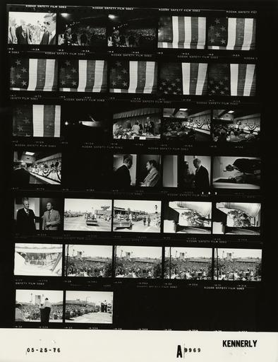 Keywords: Ford A9969 NLGRF photo contact sheet (1976-05-25)(Gerald Ford Library).jpg White House Photographic Office WHPO is housed at the Gerald R Ford Presidential Library a branch of the National Archives and Records Administration NARA <br/><br/> This file is a 200 dpi photo contact sheet having images from roll of film A9969 of the August 9 1974 - January 20 1977 Gerald R Ford White House Photographic Office Series A0001-A9999 and B0001-B2886 photographs <br/><br/> The date on the photo contact sheet is the date the roll of film was processed not necessarily the date the photographs were taken See table below for additional details 1976-05-25 Gerald R Ford Presidential Library Image http //www fordlibrarymuseum gov/library/whphotos/A9969_NLGRF jpg A9969_NLGRF jpg from http //www fordlibrarymuseum gov/library/whphotos/19760525whpo pdf White House Photographs May 25 1976 of the http //www fordlibrarymuseum gov/Library/whphotos/whpo asp White House Photographic Collection page White House Photographic Office WHPO <br/> Creator David Hume Kennerly PD-USGov Institution Institution Gerald R Ford Presidential Library Table wikitable sortable + Photo contact sheet A9969 U S President Ford Administration Gerald R Ford Library Frame s Tone Subject proper Subject generic Names Geographic Location Photographer Date - 2A BW Trip to California; Airport Arrival; San Jose Mayor PFC County Chairman Burke - San Jose California standing together on tarmac GRF Mayor Janet Gray Hayes Halsey C Burke Media San Jose CA San Jose Municipal Airport Kennerly 1976-05-25 - 3A-13A BW Trip to California; San Jose Chamber of Commerce Public Rally -San Jose California GRF at podium onstage in dark room; close up shots of GRF taken through the American flag GRF Audience Platform Guests San Jose CA Center for the Performing Arts Kennerly 1976-05-25 - 14A-17A BW Trip to California; Dedication of the San Jose Foreign Trade Zone 18 Luncheon; Chamber of Commerce; Rotary Club - San Jose California GRF at podium; all platform guests may not be shown GRF Evelle Younger Mr Mrs Halsey Burke Mr Mrs David Packard Mr Mrs Jos Philbrick Mr Mrs Paul Mariani Jr Ted Tedesco Jos Ridder Mr Mrs Ronald James Mr Mrs Drace Kutnewsky Reps Peter McCloskey Alfonso Bell Rev Clarence Sands San Jose CA McCabe Hall Kennerly 1976-05-25 - 18A BW Trip to California -San Jose California San Jose CA Kennerly 1976-05-25 - 19A-22A BW Trip to California; Chief of Staff - San Jose California GRF Cheney San Jose CA McCabe Hall Kennerly 1976-05-25 - 23A-24A BW Trip to California; Motorcade - Walnut Creek California 2 limos riding down street lined with crowds; view of USSS in back of second limo; GRF in first limo GRF Secret Service limousine Crowd Walnut Creek CA Motorcade enroute McCabe Hall to Walnut Creek Town Square Kennerly 1976-05-25 - 25A-33A BW Trip to California; Walnut Creek Campaign Rally; Remarks - Walnut Creek California view of bell USSS; long shots GRF onstage; midrange side and rear shots GRF on stage GRF Crowd Secret Service Liberty Bell Walnut Creek CA Walnut Creek Town Square Kennerly 1976-05-25 Gerald R Ford Presidential Library and Museum-cooperation PD-USGov Contact sheets by the Ford White House May 1976 Photographs by David Hume Kennerly from 1976 |