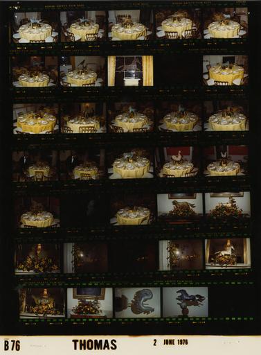 | Keywords: Ford B0076 NLGRF photo contact sheet (1976-06-02)(Gerald Ford Library).jpg White House Photographic Office WHPO is housed at the Gerald R Ford Presidential Library a branch of the National Archives and Records Administration NARA <br/><br/> This file is a 200 dpi photo contact sheet having images from roll of film B0076 of the August 9 1974 - January 20 1977 Gerald R Ford White House Photographic Office Series A0001-A9999 and B0001-B2886 photographs <br/><br/> The date on the photo contact sheet is the date the roll of film was processed not necessarily the date the photographs were taken See table below for additional details 1976-06-02 Gerald R Ford Presidential Library Image http //www fordlibrarymuseum gov/library/whphotos/B0076_NLGRF jpg B0076_NLGRF jpg from http //www fordlibrarymuseum gov/library/whphotos/19760602whpo pdf White House Photographs June 2 1976 of the http //www fordlibrarymuseum gov/Library/whphotos/whpo asp White House Photographic Collection page White House Photographic Office WHPO - Thomas PD-USGov Institution Institution Gerald R Ford Presidential Library Table wikitable sortable + Photo contact sheet B0076 U S President Ford Administration Gerald R Ford Library Frame s Tone Subject proper Subject generic Names Geographic Location Photographer Date - 3-9 Color Table Settings and Centerpieces for State Dinner Held in Honor of the King and Queen of Spain table settings with weathervane centerpieces East Room Thomas 1976-06-02 - 10 Color Table Settings and Centerpieces for State Dinner Held in Honor of the King and Queen of Spain horse weathervane on pedestal in front of window East Room Thomas 1976-06-02 - 11 Color Thomas 1976-06-02 - 12-17 Color Table Settings and Centerpieces for State Dinner Held in Honor of the King and Queen of Spain table settings with weathervane centerpieces East Room Thomas 1976-06-02 - 18-19 Color Table Settings and Centerpieces for State Dinner Held in Honor of the King and Queen of Spain - Head Butler straightening tableware; table settings with weathervane centerpieces Gene Allen East Room Thomas 1976-06-02 - 20-23 Color Table Settings and Centerpieces for State Dinner Held in Honor of the King and Queen of Spain table settings with weathervane centerpieces East Room Thomas 1976-06-02 - 24 Color Thomas 1976-06-02 - 25 Color Table Settings and Centerpieces for State Dinner Held in Honor of the King and Queen of Spain table settings with weathervane centerpieces East Room Thomas 1976-06-02 - 26-36 Color Table Settings and Centerpieces for State Dinner Held in Honor of the King and Queen of Spain weathervanes placed in floral arrangements on side tables and pedestals East Room Thomas 1976-06-02 Gerald R Ford Presidential Library and Museum-cooperation PD-USGov Contact sheets by the Ford White House June 1976 |