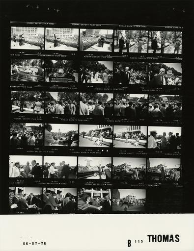 | Keywords: Ford B0115 NLGRF photo contact sheet (1976-06-07)(Gerald Ford Library).jpg White House Photographic Office WHPO is housed at the Gerald R Ford Presidential Library a branch of the National Archives and Records Administration NARA <br/><br/> This file is a 200 dpi photo contact sheet having images from roll of film B0115 of the August 9 1974 - January 20 1977 Gerald R Ford White House Photographic Office Series A0001-A9999 and B0001-B2886 photographs <br/><br/> The date on the photo contact sheet is the date the roll of film was processed not necessarily the date the photographs were taken See table below for additional details 1976-06-07 Gerald R Ford Presidential Library Image http //www fordlibrarymuseum gov/library/whphotos/B0115_NLGRF jpg B0115_NLGRF jpg from http //www fordlibrarymuseum gov/library/whphotos/19760607whpo pdf White House Photographs June 7 1976 of the http //www fordlibrarymuseum gov/Library/whphotos/whpo asp White House Photographic Collection page White House Photographic Office WHPO - Thomas PD-USGov Institution Institution Gerald R Ford Presidential Library Table wikitable sortable + Photo contact sheet B0115 U S President Ford Administration Gerald R Ford Library Frame s Tone Subject proper Subject generic Names Geographic Location Photographer Date - 3A-5A B Campaign Trip to Ohio - Campaign Rally in Dayton Ohio GRF at lectern waving; back nearly facing camera; various angles and distances; crowd in background GRF Crowd Dayton OH Downtown Street Thomas 1976-06-07 - 6A-7a B Campaign Trip to Ohio; Following Stop for Refreshments - Springfield Ohio GRF and patrolman handshaking standing talking; man standing to right holding walkie-talkie GRF Ohio Highway Patrolman; Unidentified Man Springfield OH Snyder Park Thomas 1976-06-07 - 8A B Campaign Trip to Ohio; Following Stop for Refreshments - Springfield Ohio media climbing onto vehicle in foreground; others standing watching laughing in background Media; Others Springfield OH Snyder Park Thomas 1976-06-07 - 9A B Campaign Trip to Ohio; Motorcade from Snyder Park to Springfield Art Center; US Senator from Ohio OH - Springfield Ohio GRF Taft and man standing in limousine; Secret Service flanking vehicle; taken from front of limousine GRF Sen Taft Unidentified Man; Secret Service Crowd Springfield OH Snyder Park Thomas 1976-06-07 - 10A B Campaign Trip to Ohio; Arrival at Springfield Art Center; Mayor of Springfield - Springfield Ohio GRF and Baker walking talking; others in background GRF Mayor Roger Baker; Secret Service Crowd Springfield OH Springfield Art Center Thomas 1976-06-07 - 11A-12a B Campaign Trip to Ohio; Arrival at Springfield Art Center - Springfield Ohio GRF walking past crowd toward stage; all not in both frames GRF Others; Secret Service Crowd Springfield OH Springfield Art Center Thomas 1976-06-07 - 13A B Campaign Trip to Ohio; Campaign Rally at Springfield Art Center - Springfield Ohio GRF on stage back to camera waving; crowd in background GRF Others Crowd Springfield OH Springfield Art Center Thomas 1976-06-07 - 14A-18a B Campaign Trip to Ohio; Campaign Rally at Springfield Art Center - Springfield Ohio greeting handshaking minging talking; various angles and distances; all not in every frame GRF Crowd Springfield OH Springfield Art Center Thomas 1976-06-07 - 19A B Campaign Trip to Ohio; Campaign Rally at Springfield Art Center - Springfield Ohio GRF and men in foreground handshaking; crowd in background GRF Two Unidentified Men; Crowd Springfield OH Springfield Art Center Thomas 1976-06-07 - 20A-21a B Campaign Trip to Ohio - Campaign Rally at Lima Mall Lima Ohio GRF at lectern speaking; others seated in background; Lazarus Department Store in background GRF Platform Guests R Townsend M Moore W McGough M Workman H Moyer A Neu Gov Rhodes Governor R Holmes K McGough Sen Taft Rep Guyer W White W Rose ; Secret Service Lima OH Lima Mall Thomas 1976-06-07 - 22A-24a B Campaign Trip to Ohio - Campaign Rally at Lima Mall Lima Ohio greeting handshaking near limousine GRF Police Officers Lima OH Lima Mall Thomas 1976-06-07 - 25A B Campaign Trip to Ohio - Campaign Rally at Lima Mall Lima Ohio GRF walking toward limousine waving; crowd in background GRF Crowd Lima OH Lima Mall Thomas 1976-06-07 - 26A-27a B Campaign Trip to Ohio - Arrival for Campaign Rally at Elks Club Findlay Ohio GRF walking alongside limousine waving; crowd in background GRF Crowd; Secret Service Findlay OH Elks Club -Outside Thomas 1976-06-07 - 28A-30a B Campaign Trip to Ohio - Campaign Rally at Elks Club Findlay Ohio greeting handshaking near podium; crowd in background GRF Gov Rhodes Sen Taft Rep Latta; Crowd; Secret Service Findlay OH Elks Club -Outside Thomas 1976-06-07 - 31A B Campaign Trip to Ohio - Following Campaign Rally at Elks Club Findlay Ohio GRF standing in limousine waving; crowd in background; long shot GRF Crowd; Secret Service Findlay OH Elks Club -Outside Thomas 1976-06-07 Gerald R Ford Presidential Library and Museum-cooperation PD-USGov Contact sheets by the Ford White House June 1976 |