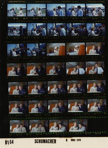 | Keywords: Ford B0164 NLGRF photo contact sheet (1976-06-08)(Gerald Ford Library).jpg White House Photographic Office WHPO is housed at the Gerald R Ford Presidential Library a branch of the National Archives and Records Administration NARA <br/><br/> This file is a 200 dpi photo contact sheet having images from roll of film B0164 of the August 9 1974 - January 20 1977 Gerald R Ford White House Photographic Office Series A0001-A9999 and B0001-B2886 photographs <br/><br/> The date on the photo contact sheet is the date the roll of film was processed not necessarily the date the photographs were taken See table below for additional details 1976-06-08 Gerald R Ford Presidential Library Image http //www fordlibrarymuseum gov/library/whphotos/B0164_NLGRF jpg B0164_NLGRF jpg from http //www fordlibrarymuseum gov/library/whphotos/19760608whpo pdf White House Photographs June 8 1976 of the http //www fordlibrarymuseum gov/Library/whphotos/whpo asp White House Photographic Collection page White House Photographic Office WHPO - Schumacher PD-USGov Institution Institution Gerald R Ford Presidential Library Table wikitable sortable + Photo contact sheet B0164 U S President Ford Administration Gerald R Ford Library Frame s Tone Subject proper Subject generic Names Geographic Location Photographer Date - 2A-3A Color First Lady's Campaign Trip to Michigan standing talking handshaking Betty Ford Unidentified Man Grand Rapids MI Unidentified Location Schumacher 1976-06-08 - 4A-5A Color First Lady's Campaign Trip to Michigan - Prior to Departure for Andrews Air Force Base standing talking handshaking; C-9 Convair Aircraft in background Betty Ford Unidentified Man Grand Rapids MI Kent County Airport Schumacher 1976-06-08 - 6A Color First Lady's Campaign Trip to Michigan - Prior to Departure for Andrews Air Force Base standing talking handshaking; C-9 Convair Aircraft in background Betty Ford Unidentified Man Grand Rapids MI Kent County Airport Schumacher 1976-06-08 - 7A Color First Lady's Campaign Trip to Michigan - Prior to Departure for Andrews Air Force Base standing talking handshaking; C-9 Convair Aircraft in background Betty Ford Unidentified Man Grand Rapids MI Kent County Airport Schumacher 1976-06-08 - 8A-13A Color First Lady's Campaign Trip to Michigan - Prior to Departure for Andrews Air Force Base standing talking handshaking; various distances; all not in every frame; C-9 Convair Aircraft in background Betty Ford Unidentified Men Michigan State Police Officers Grand Rapids MI Kent County Airport Schumacher 1976-06-08 - 14A-15A Color Flight for Grand Rapids Michigan to Andrews Air Force Base BF seated turning to face camera; wearing faux straw hat that reads The Backroom Saloon on the hatband; woman seated in background holding magazine laughing Betty Ford; Unidentified Woman C-9 Convair Aircraft Schumacher 1976-06-08 - 16A-17A Color Flight for Grand Rapids Michigan to Andrews Air Force Base seated side by side posing; man has patch on blazer Betty Ford; Unidentified Man C-9 Convair Aircraft Schumacher 1976-06-08 - 18A-19A Color Flight for Grand Rapids Michigan to Andrews Air Force Base seated side by side posing; man has patch on blazer Betty Ford; Unidentified Man C-9 Convair Aircraft Schumacher 1976-06-08 - 20A-21A Color Flight for Grand Rapids Michigan to Andrews Air Force Base seated side by side posing; name tag may read Bookman Betty Ford; Unidentified Man Bookman C-9 Convair Aircraft Schumacher 1976-06-08 - 22A-23A Color Flight for Grand Rapids Michigan to Andrews Air Force Base seated side by side posing Betty Ford; Unidentified Air Force E-6 Technical Sergeant C-9 Convair Aircraft Schumacher 1976-06-08 - 24A-25A Color Flight for Grand Rapids Michigan to Andrews Air Force Base seated side by side posing Betty Ford; Unidentified Air Force E-6 Technical Sergeant C-9 Convair Aircraft Schumacher 1976-06-08 - 26A-27A Color Flight for Grand Rapids Michigan to Andrews Air Force Base seated side by side posing Betty Ford; Unidentified Air Force E-6 Technical Sergeant C-9 Convair Aircraft Schumacher 1976-06-08 - 28A-29A Color Flight for Grand Rapids Michigan to Andrews Air Force Base seated side by side posing Betty Ford; Unidentified Air Force E-6 Technical Sergeant C-9 Convair Aircraft Schumacher 1976-06-08 - 30A-31A Color Flight for Grand Rapids Michigan to Andrews Air Force Base seated side by side posing; man has patch on blazer Betty Ford; Unidentified Man C-9 Convair Aircraft Schumacher 1976-06-08 - 32A-33A Color Flight for Grand Rapids Michigan to Andrews Air Force Base seated side by side posing; man has patch on blazer Betty Ford; Unidentified Man C-9 Convair Aircraft Schumacher 1976-06-08 - 34A-35A Color Flight for Grand Rapids Michigan to Andrews Air Force Base seated side by side posing; man has patch on blazer Betty Ford; Unidentified Man C-9 Convair Aircraft Schumacher 1976-06-08 Gerald R Ford Presidential Library and Museum-cooperation PD-USGov Contact sheets by the Ford White House June 1976 |