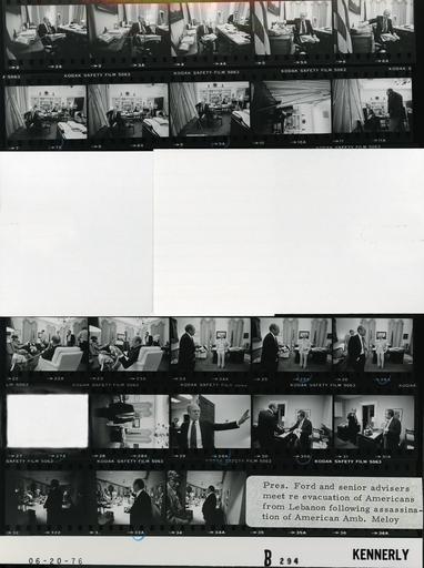 Keywords: Ford B0294 NLGRF photo contact sheet (1976-06-19)(Gerald Ford Library).jpg White House Photographic Office WHPO is housed at the Gerald R Ford Presidential Library a branch of the National Archives and Records Administration NARA <br/><br/> This file is a 200 dpi photo contact sheet having images from roll of film B0294 of the August 9 1974 - January 20 1977 Gerald R Ford White House Photographic Office Series A0001-A9999 and B0001-B2886 photographs <br/><br/> The date on the photo contact sheet is the date the roll of film was processed not necessarily the date the photographs were taken See table below for additional details 1976-06-19 Gerald R Ford Presidential Library Image http //www fordlibrarymuseum gov/library/whphotos/B0294_NLGRF jpg B0294_NLGRF jpg from http //www fordlibrarymuseum gov/library/whphotos/19760619whpo pdf White House Photographs June 19 1976 of the http //www fordlibrarymuseum gov/Library/whphotos/whpo asp White House Photographic Collection page White House Photographic Office WHPO <br/> Creator David Hume Kennerly PD-USGov Institution Institution Gerald R Ford Presidential Library Table wikitable sortable + Photo contact sheet B0294 U S President Ford Administration Gerald R Ford Library Frame s Tone Subject proper Subject generic Names Geographic Location Photographer Date - 13A B Beirut Lebanon Crisis - Late Night Meeting with National Security Adviser and Senior Staff Regarding the Crisis in Beirut Lebanon GRF seated at desk talking on telephone; secretary pouring coffee GRF Scowcroft's Secretary Scowcroft's Office Kennerly 1976-06-19 - 2A-6A B Beirut Lebanon Crisis - Late Night Meeting with National Security Adviser and Senior Staff Regarding the Crisis in Beirut Lebanon GRF seated at Scowcroft's desk papers on lap; talking on telephone; hanging up phone in last two frames GRF Scowcroft's Office Kennerly 1976-06-20 - 7A-9A B Beirut Lebanon Crisis - Late Night Meeting with National Security Adviser and Senior Staff Regarding the Crisis in Beirut Lebanon GRF seated looking at photo on easel; others seated standing talking in background GRF; Hyland Scowcroft Cheney Unidentified NSC staff Member Scowcroft's Office Kennerly 1976-06-20 - 10A B Beirut Lebanon Crisis - Late Night Meeting with National Security Adviser and Senior Staff Regarding the Crisis in Beirut Lebanon seated looking at photo on easel GRF Scowcroft's Office Kennerly 1976-06-20 - 11A B Beirut Lebanon Crisis - Late Night Meeting with National Security Adviser and Senior Staff Regarding the Crisis in Beirut Lebanon GRF seated photo on easel; looking up at Hyland; close up GRF Hyland Scowcroft's Office Kennerly 1976-06-20 - 12A B Beirut Lebanon Crisis - Late Night Meeting with National Security Adviser and Senior Staff Regarding the Crisis in Beirut Lebanon GRF seated photo on easel; looking up at Hyland; long shot from across room GRF Hyland Scowcroft's Office Kennerly 1976-06-20 - 14A-19A B Beirut Lebanon Crisis - Late Night Meeting with National Security Adviser and Senior Staff Regarding the Crisis in Beirut Lebanon GRF seated at desk talking on telephone; various angles and distances GRF Scowcroft's Office Kennerly 1976-06-20 - 20A B Beirut Lebanon Crisis - Late Night Meeting with National Security Adviser and Senior Staff Regarding the Crisis in Beirut Lebanon GRF seated at desk; taken from desktop level GRF Scowcroft's Office Kennerly 1976-06-20 - 21A B REDACTED Kennerly 1976-06-20 - 22A-23A B Beirut Lebanon Crisis - Late Night Meeting with National Security Adviser and Senior Staff Regarding the Crisis in Beirut Lebanon GRF in foreground seated in chair back to camera; talking on phone in 1st frame; hanging up phone in 2nd; others seated standing moving about in background GRF Schmults Cheney Nessen Scowcroft Hyland Marsh Scowcroft's Office Kennerly 1976-06-20 - 24A-26A B Beirut Lebanon Crisis - Late Night Meeting with National Security Adviser and Senior Staff Regarding the Crisis in Beirut Lebanon standing talking; Scowcroft leaning against desk hands in pockets GRF Scowcroft Scowcroft's Office Kennerly 1976-06-20 - 27A B Beirut Lebanon Crisis - Late Night Meeting with National Security Adviser and Senior Staff Regarding the Crisis in Beirut Lebanon standing laughing; Scowcroft leaning against desk hands in pockets GRF Scowcroft Schmults Scowcroft's Office Kennerly 1976-06-20 - 28A B Beirut Lebanon Crisis - Late Night Meeting with National Security Adviser and Senior Staff Regarding the Crisis in Beirut Lebanon GRF walking toward camera smiling; Scowcroft leaning against desk hands in pockets GRF Scowcroft Scowcroft's Office Kennerly 1976-06-20 - 29A B Beirut Lebanon Crisis - Late Night Meeting with National Security Adviser and Senior Staff Regarding the Crisis in Beirut Lebanon walking through doorway looking back waving; Hyland in background in next room GRF Hyland Scowcroft's Office Kennerly 1976-06-20 - 30A B Beirut Lebanon Crisis - Late Night Meeting with National Security Adviser and Senior Staff Regarding the Crisis in Beirut Lebanon talking handshaking GRF Hyland Room outside Scowcroft's Office Kennerly 1976-06-20 - 31A B Beirut Lebanon Crisis - Late Night Meeting with National Security Adviser and Senior Staff Regarding the Crisis in Beirut Lebanon GRF moving away from camera toward doorway; Hyland standing at desk looking toward GRF GRF Hyland Room outside Scowcroft's Office Kennerly 1976-06-20 - 32A-34A B Beirut Lebanon Crisis - Late Night Meeting with National Security Adviser and Senior Staff Regarding the Crisis in Beirut Lebanon GRF in foreground in doorway waving; others in background in office GRF Unidentified NSC staff NSC Staff Office Kennerly 1976-06-20 Gerald R Ford Presidential Library and Museum-cooperation PD-USGov Contact sheets by the Ford White House June 1976 Photographs by David Hume Kennerly from 1976
