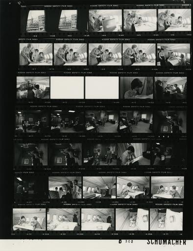| Keywords: Ford B0302 NLGRF photo contact sheet (1976-06-18)(Gerald Ford Library).jpg White House Photographic Office WHPO is housed at the Gerald R Ford Presidential Library a branch of the National Archives and Records Administration NARA <br/><br/> This file is a 200 dpi photo contact sheet having images from roll of film B0302 of the August 9 1974 - January 20 1977 Gerald R Ford White House Photographic Office Series A0001-A9999 and B0001-B2886 photographs <br/><br/> The date on the photo contact sheet is the date the roll of film was processed not necessarily the date the photographs were taken See table below for additional details 1976-06-18 Gerald R Ford Presidential Library Image http //www fordlibrarymuseum gov/library/whphotos/B0302_NLGRF jpg B0302_NLGRF jpg from http //www fordlibrarymuseum gov/library/whphotos/19760618whpo pdf White House Photographs June 18 1976 of the http //www fordlibrarymuseum gov/Library/whphotos/whpo asp White House Photographic Collection page White House Photographic Office WHPO - Schumacher PD-USGov Institution Institution Gerald R Ford Presidential Library Table wikitable sortable + Photo contact sheet B0302 U S President Ford Administration Gerald R Ford Library Frame s Tone Subject proper Subject generic Names Geographic Location Photographer Date - 2-3 B First Lady's Trip to New York City buildings; 1 shop front identified as R T Coin-Op Cleaners; taken out of limousine New York NY Unidentified Location Schumacher 1976-06-18 - 4 B First Lady's Trip to New York City - Flight from Laguardia International Airport to Andrews Air Force Base seated at table of C-9 Convair Aircraft; open brief case with President Ford sticker on top lying on table Unidentified Man First Lady's staff C-9 Convair Aircraft Schumacher 1976-06-18 - 5-10 BW First Lady's Trip to New York City - Flight from Laguardia International Airport to Andrews Air Force Base Chirdon seated at table; BF and others standing in aisle of C-9 Convair Aircraft laughing smiling; various angles and distances Betty Ford Weidenfeld Nancy Chirdon First Lady's staff C-9 Convair Aircraft Schumacher 1976-06-18 - 11-12 BW First Lady's Trip to New York City - Flight from Laguardia International Airport to Andrews Air Force Base BF and Chirdon seated at table; others standing in aisle of C-9 Convair Aircraft laughing smiling; various angles and distances Betty Ford Weidenfeld Nancy Chirdon First Lady's staff C-9 Convair Aircraft Schumacher 1976-06-18 - 13-14 B Schumacher 1976-06-18 - 15 B First Lady's Trip to New York City - Flight from Laguardia International Airport to Andrews Air Force Base seated at table of C-9 Convair Aircraft; talking on telephone; close up Weidenfeld C-9 Convair Aircraft Schumacher 1976-06-18 - 16 BW First Lady's Trip to New York City - Flight from Laguardia International Airport to Andrews Air Force Base BF Pullen and woman seated at table; man leaning across aisle of C-9 Convair Aircraft Betty Ford Nancy Chirdon Unidentified Woman ; Unidentified Man First Lady's staff C-9 Convair Aircraft Schumacher 1976-06-18 - 17-21 BW East Wing Staff BF seated in chair woman working on BF's hair; Pullen watching; others moving around room Betty Ford Unidentified Woman; Nancy Chirdon First Lady's staff Unidentified East Wing Office Schumacher 1976-06-18 - 22-23 BW East Wing seated in chair talking on telephone Betty Ford Unidentified East Wing Office Schumacher 1976-06-18 - 24 BW East Wing Staff BF seated in chair talking on telephone; woman working on BF's hair Betty Ford Unidentified Woman; Secret Service Unidentified East Wing Office Schumacher 1976-06-18 - 25 B talking on telephone taking notes; taken over right shoulder Weidenfeld Unidentified East Wing Office Schumacher 1976-06-18 - 26-27 BW East Wing BF seated; Weidenfeld talking showing notes Betty Ford Weidenfeld Unidentified East Wing Office Schumacher 1976-06-18 - 28 BW First Lady's Trip to Iowa -Flight to Des Moines Municipal Airport Des Moines Iowa IA from Andrews Air Force Base BF and men seated; woman standing in aisle of C-9 Convair Aircraft Betty Ford; Two Unidentified Men Unidentified Woman C-9 Convair Aircraft Schumacher 1976-06-18 - 29 BW First Lady's Trip to Iowa -Flight to Des Moines Municipal Airport Des Moines Iowa IA from Andrews Air Force Base seated reading wearing glasses Betty Ford C-9 Convair Aircraft Schumacher 1976-06-18 - 30-32 BW First Lady's Trip to Iowa -Flight to Des Moines Municipal Airport Des Moines Iowa IA from Andrews Air Force Base seated across table from each other talking Betty Ford Unidentified Woman C-9 Convair Aircraft Schumacher 1976-06-18 - 33-36 BW First Lady's Trip to Iowa -Flight to Des Moines Municipal Airport Des Moines Iowa IA from Andrews Air Force Base seated at table talking on telephone Betty Ford C-9 Convair Aircraft Schumacher 1976-06-18 Gerald R Ford Presidential Library and Museum-cooperation PD-USGov Contact sheets by the Ford White House June 1976 |