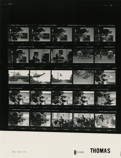 | Keywords: Ford B0433 NLGRF photo contact sheet (1976-06-21)(Gerald Ford Library).jpg White House Photographic Office WHPO is housed at the Gerald R Ford Presidential Library a branch of the National Archives and Records Administration NARA <br/><br/> This file is a 200 dpi photo contact sheet having images from roll of film B0433 of the August 9 1974 - January 20 1977 Gerald R Ford White House Photographic Office Series A0001-A9999 and B0001-B2886 photographs <br/><br/> The date on the photo contact sheet is the date the roll of film was processed not necessarily the date the photographs were taken See table below for additional details 1976-06-21 Gerald R Ford Presidential Library Image http //www fordlibrarymuseum gov/library/whphotos/B0433_NLGRF jpg B0433_NLGRF jpg from http //www fordlibrarymuseum gov/library/whphotos/19760621whpo pdf White House Photographs June 21 1976 of the http //www fordlibrarymuseum gov/Library/whphotos/whpo asp White House Photographic Collection page White House Photographic Office WHPO - Thomas PD-USGov Institution Institution Gerald R Ford Presidential Library Table wikitable sortable + Photo contact sheet B0433 U S President Ford Administration Gerald R Ford Library Frame s Tone Subject proper Subject generic Names Geographic Location Photographer Date - 5A-10A BW Following Meeting with Members of Congress to Discuss School Desegregation standing near table looking at document Levy is holding Cannon Levi Cabinet Room Thomas 1976-06-21 - 11A-12A BW Following Meeting with Members of Congress to Discuss School Desegregation - Deputy Counsel standing talking near table Cannon Levi Cabinet Room Thomas 1976-06-21 - 13A-14A BW Prior to Departure for Andrews Air Force Base for Flight to Dorado Beach Puerto Rico walking toward Marine One copter not seen ; guard shack in background GRF Kennerly O'Donnell Secret Service Military Aide South Driveway Thomas 1976-06-26 - 15A-17A BW Departure for Andrews Air Force Base for Flight to Dorado Beach Puerto Rico Marine One ascending; Washington Monument visible beyond copter South Lawn Thomas 1976-06-26 - 18A BW Luncheon in Honor of the Prime Minister of Japan mirrored wall sconce State Dining Room Thomas 1976-06-30 - 19A-24A BW Luncheon in Honor of the Prime Minister of Japan; Interpreter Yanazaki GRF standing making remarks; all guests not in frames GRF Takeo Miki; Head Table Guests Ryichiro Yanazaki; guests State Dining Room Thomas 1976-06-30 - 25A-28A BW Luncheon in Honor of the Prime Minister of Japan; Interpreter Yanazaki Miki standing making remarks; all guests not in frames GRF Takeo Miki; Head Table Guests Ryichiro Yanazaki; guests State Dining Room Thomas 1976-06-30 - 29A BW Taping Audio-visual Bicentennial Message for National Broadcas seated in wing chair; watching taping Unidentified Boy Oval Office Thomas 1976-06-30 Gerald R Ford Presidential Library and Museum-cooperation PD-USGov Contact sheets by the Ford White House June 1976 |