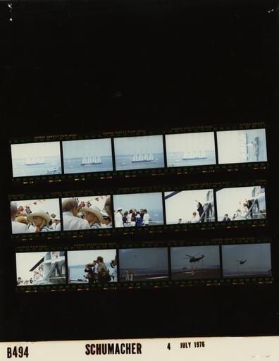Keywords: Ford B0494 NLGRF photo contact sheet (1976-07-04)(Gerald Ford Library).jpg White House Photographic Office WHPO is housed at the Gerald R Ford Presidential Library a branch of the National Archives and Records Administration NARA <br/><br/> This file is a 200 dpi photo contact sheet having images from roll of film B0494 of the August 9 1974 - January 20 1977 Gerald R Ford White House Photographic Office Series A0001-A9999 and B0001-B2886 photographs <br/><br/> The date on the photo contact sheet is the date the roll of film was processed not necessarily the date the photographs were taken See table below for additional details 1976-07-04 Gerald R Ford Presidential Library Image http //www fordlibrarymuseum gov/library/whphotos/B0494_NLGRF jpg B0494_NLGRF jpg from http //www fordlibrarymuseum gov/library/whphotos/19760704whpo pdf White House Photographs July 4 1976 of the http //www fordlibrarymuseum gov/Library/whphotos/whpo asp White House Photographic Collection page White House Photographic Office WHPO - Schumacher PD-USGov Institution Institution Gerald R Ford Presidential Library Table wikitable sortable + Photo contact sheet B0494 U S President Ford Administration Gerald R Ford Library Frame s Tone Subject proper Subject generic Names Geographic Location Photographer Date - 2-6 Color 4th of July Bicentennial Event - Operation Sail - Flight to USS Forrestal CV-59 Unidentified Tall Ship at full sail not listed in ship inventory ; tugboat in 1st and 5th frames; copter not in frames New York Harbor New York City NY Helicopter Schumacher 1976-07-04 - 7-8 Color 4th of July Bicentennial Event - Arrival on Deck of USS Forrestal CV-59 standing talking; man's back to camera; Susan wearing large sun hat; close ups Susan Ford; Unidentified Man New York Harbor New York City NY USS Forrestal CV-59 - Flight Deck Schumacher 1976-07-04 - 9 Color 4th of July Bicentennial Event - Arrival on Deck of USS Forrestal CV-59 greeting handshaking smiling talking; all not in frame GRF Children Adults Naval Officer New York Harbor New York City NY USS Forrestal CV-59 - Flight Deck Schumacher 1976-07-04 - 10-11 Color 4th of July Bicentennial Event - Prior to Departure from USS Forrestal CV-59 for Flight to USS Nashville LPD-13 GRF and BF standing in doorway of Marine One waving; Susan at base of steps in 2nd frame GRF Betty Ford; Susan Ford New York Harbor New York City NY USS Forrestal CV-59 - Flight Deck Schumacher 1976-07-04 - 12 Color 4th of July Bicentennial Event - Prior to Departure from USS Forrestal CV-59 for Flight to USS Nashville LPD-13 standing in doorway of Marine One waving; wearing large sunhat Susan Ford New York Harbor New York City NY USS Forrestal CV-59 - Flight Deck Schumacher 1976-07-04 - 13 Color 4th of July Bicentennial Event - Departure from USS Forrestal CV-59 for Flight to USS Nashville LPD-13 Watching Marine One not shown take off; all not in frames Small Group of People New York Harbor New York City NY USS Forrestal CV-59 - Flight Deck Schumacher 1976-07-04 - 14 Color 4th of July Bicentennial Event - Departure from USS Forrestal CV-59 for Flight to USS Nashville LPD-13 Men on flight deck; Marine One in flight in distance; Verazanno Narrows bridge in background Two Navy Personnel New York Harbor New York City NY USS Forrestal CV-59 - Flight Deck Schumacher 1976-07-04 - 15-16 Color 4th of July Bicentennial Event - Departure from USS Forrestal CV-59 for Flight to USS Nashville LPD-13 helicopter in flight; Verazanno Narrows bridge in background New York Harbor New York City NY USS Forrestal CV-59 - Flight Deck Schumacher 1976-07-04 Gerald R Ford Presidential Library and Museum-cooperation PD-USGov Contact sheets by the Ford White House July 1976