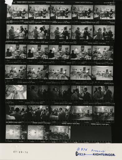 Keywords: Ford B0876 NLGRF photo contact sheet (1976-07-29)(Gerald Ford Library).jpg White House Photographic Office WHPO is housed at the Gerald R Ford Presidential Library a branch of the National Archives and Records Administration NARA <br/><br/> This file is a 200 dpi photo contact sheet having images from roll of film B0876 of the August 9 1974 - January 20 1977 Gerald R Ford White House Photographic Office Series A0001-A9999 and B0001-B2886 photographs <br/><br/> The date on the photo contact sheet is the date the roll of film was processed not necessarily the date the photographs were taken See table below for additional details 1976-07-29 Gerald R Ford Presidential Library Image http //www fordlibrarymuseum gov/library/whphotos/B0876_NLGRF jpg B0876_NLGRF jpg from http //www fordlibrarymuseum gov/library/whphotos/19760729whpo pdf White House Photographs July 29 1976 of the http //www fordlibrarymuseum gov/Library/whphotos/whpo asp White House Photographic Collection page White House Photographic Office WHPO <br/> Creator David Hume Kennerly PD-USGov Institution Institution Gerald R Ford Presidential Library Table wikitable sortable + Photo contact sheet B0876 U S President Ford Administration Gerald R Ford Library Frame s Tone Subject proper Subject generic Names Geographic Location Photographer Date - 2-3 BW Meeting with Chairman of the Republican National Committee RNC seated at desk talking; taken from right of GRF GRF Mary Louise Smith Oval Office Kennerly 1976-07-29 - 4 BW Meeting with Chairman of the Republican National Committee RNC seated at desk talking; Smith handing GRF document; taken from right of GRF GRF Mary Louise Smith Oval Office Kennerly 1976-07-29 - 5-6 BW Meeting with Chairman of the Republican National Committee RNC seated at desk talking; GRF reading document; taken from right of GRF; Cheney in 2nd frame only GRF Mary Louise Smith; Cheney Oval Office Kennerly 1976-07-29 - 7-8 BW Meeting with White House Correspondent NBC News greeting handshaking standing talking GRF Tom Meredith Brokaw Oval Office Kennerly 1976-07-29 - 9-11 BW Meeting with White House Correspondent NBC News standing talking handshaking; laughing in last frame; Nessen in last frame only GRF Tom Brokaw; Nessen Oval Office Kennerly 1976-07-29 - 12-18 BW Meeting with White House Correspondent NBC News seated talking near fireplace; various angles and distances GRF Tom Meredith Brokaw Oval Office Kennerly 1976-07-29 - 19-21 BW Meeting with White House Correspondent NBC News seated talking near fireplace; various angles; long shots from near desk GRF Tom Meredith Brokaw Nessen Cheney Oval Office Kennerly 1976-07-29 - 22 BW seated at desk talking on telephone Unidentified Woman staff Unidentified Office Kennerly 1976-07-29 - 23-24 BW Reception for Pennsylvania State Delegates and Alternates to the Republican National Convention GRF and BF entering room; others standing applauding; all not in frames GRF Betty Ford Pennsylvania State Delegates to the Republican National Convention East Room Kennerly 1976-07-29 - 25-26 BW Reception for Pennsylvania State Delegates and Alternates to the Republican National Convention standing talking looking at notes; close up shots Cheney James Baker East Room Kennerly 1976-07-29 - 27-29 BW Reception for Pennsylvania State Delegates and Alternates to the Republican National Convention greeting handshaking standing talking; various angles and distances; all not in every frame; man with eye patch in 3rd frame GRF Pennsylvania State Delegates to the Republican National Convention East Room Kennerly 1976-07-29 - 30-34 BW Reception for Pennsylvania State Delegates and Alternates to the Republican National Convention GRF standing speaking at lectern; others seated in foreground backs to camera; various angles; long shots from behind delegates GRF Pennsylvania State Delegates to the Republican National Convention East Room Kennerly 1976-07-29 Gerald R Ford Presidential Library and Museum-cooperation PD-USGov Contact sheets by the Ford White House July 1976 Photographs by David Hume Kennerly from 1976 |