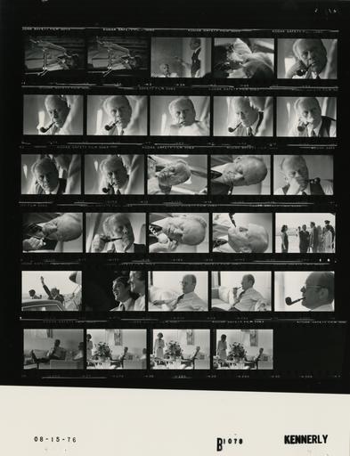 Keywords: Ford B1078 NLGRF photo contact sheet (1976-08-15)(Gerald Ford Library).jpg White House Photographic Office WHPO is housed at the Gerald R Ford Presidential Library a branch of the National Archives and Records Administration NARA <br/><br/> This file is a 200 dpi photo contact sheet having images from roll of film B1078 of the August 9 1974 - January 20 1977 Gerald R Ford White House Photographic Office Series A0001-A9999 and B0001-B2886 photographs <br/><br/> The date on the photo contact sheet is the date the roll of film was processed not necessarily the date the photographs were taken See table below for additional details 1976-08-15 Gerald R Ford Presidential Library Image http //www fordlibrarymuseum gov/library/whphotos/B1078_NLGRF jpg B1078_NLGRF jpg from http //www fordlibrarymuseum gov/library/whphotos/19760815whpo pdf White House Photographs August 15 1976 of the http //www fordlibrarymuseum gov/Library/whphotos/whpo asp White House Photographic Collection page White House Photographic Office WHPO <br/> Creator David Hume Kennerly PD-USGov Institution Institution Gerald R Ford Presidential Library Table wikitable sortable + Photo contact sheet B1078 U S President Ford Administration Gerald R Ford Library Frame s Tone Subject proper Subject generic Names Geographic Location Photographer Date - 1A-2A BW standing talking on telephone; close ups Betty Ford Second Floor - President's Private Office Kennerly 1976-08-15 - 3A BW Flight to Kansas City Missouri GRF standing coatless wearing vest; Friedersdorf seated looking up GRF Friedersdorf Air Force One - President's Cabin Kennerly 1976-08-15 - 4A-19A BW Flight to Kansas City Missouri head and shoulder portraits; smoking pipe in most frames; coatless; on telephone in 1 frame; O'Donnell's head in 3 frames GRF Air Force One - President's Cabin Kennerly 1976-08-15 - 20A-21A BW Arrival in Kansas City Missouri greeting handshaking in 1st frame; GRF waving from limousine in 2nd; all not in both frames GRF Betty Ford Others Kansas City MO Kansas City Municipal Airport Kennerly 1976-08-15 - 22A BW Trip to Kansas City Missouri - Convention - Rally Upon Arrival at the Crown Center Hotel close up; BF out of focus Betty Ford Jack Ford Kansas City MO Crown Center Hotel Kennerly 1976-08-15 - 23A-26A BW Trip to Kansas City Missouri - Convention seated on sofa coatless smoking pipe; close up portraits to medium range GRF Kansas City MO Crown Center Hotel - President's Suite Kennerly 1976-08-15 - 27A-29A BW Trip to Kansas City Missouri - Convention BF standing; GRF seated on sofa coatless smoking pipe GRF Betty Ford Kansas City MO Crown Center Hotel - President's Suite Kennerly 1976-08-15 Gerald R Ford Presidential Library and Museum-cooperation PD-USGov Contact sheets by the Ford White House August 1976 Photographs by David Hume Kennerly from 1976 |