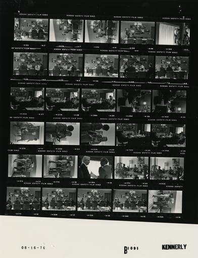 Keywords: Ford B1091 NLGRF photo contact sheet (1976-08-16)(Gerald Ford Library).jpg White House Photographic Office WHPO is housed at the Gerald R Ford Presidential Library a branch of the National Archives and Records Administration NARA <br/><br/> This file is a 200 dpi photo contact sheet having images from roll of film B1091 of the August 9 1974 - January 20 1977 Gerald R Ford White House Photographic Office Series A0001-A9999 and B0001-B2886 photographs <br/><br/> The date on the photo contact sheet is the date the roll of film was processed not necessarily the date the photographs were taken See table below for additional details 1976-08-16 Gerald R Ford Presidential Library Image http //www fordlibrarymuseum gov/library/whphotos/B1091_NLGRF jpg B1091_NLGRF jpg from http //www fordlibrarymuseum gov/library/whphotos/19760816whpo pdf White House Photographs August 16 1976 of the http //www fordlibrarymuseum gov/Library/whphotos/whpo asp White House Photographic Collection page White House Photographic Office WHPO <br/> Creator David Hume Kennerly PD-USGov Institution Institution Gerald R Ford Presidential Library Table wikitable sortable + Photo contact sheet B1091 U S President Ford Administration Gerald R Ford Library Frame s Tone Subject proper Subject generic Names Geographic Location Photographer Date - 1A-6A BW Trip to Kansas City Missouri - Convention - Convention Strategy Meeting seated around table; only GRF Hartmann and Penny facing camera; GRF caotless without tie GRF Hartmann Orben Penny Douglas Smith Kansas City MO Crown Center Hotel - President's Suite - Office Kennerly 1976-08-16 - 7A-9A BW Trip to Kansas City Missouri - Convention standing in front of table reading documents; various distances GRF Kansas City MO Crown Center Hotel - President's Suite - Office Kennerly 1976-08-16 - 10A BW Trip to Kansas City Missouri - Convention standing at window pulling drapes back looking out GRF Kansas City MO Crown Center Hotel - President's Suite - Office Kennerly 1976-08-16 - 11A-14A BW Trip to Kansas City Missouri - Convention - Meeting Minnesota Delegates to the Republican Presidential Convention seated around table talking; various angles and distances GRF Glenn Annexstad Verne Long Gene Smith Robert Jackson Robert Barry Ancher Nelson Kansas City MO Crown Center Hotel - President's Suite - Office Kennerly 1976-08-16 - 15A-17A BW Trip to Kansas City Missouri - Convention standing near desk talking walking in 2nd frame GRF Cheney Kansas City MO Crown Center Hotel - President's Suite - Office Kennerly 1976-08-16 - 18A BW Trip to Kansas City Missouri - Convention standing talking; close up profile GRF Schmults Kansas City MO Crown Center Hotel - President's Suite - Office Kennerly 1976-08-16 - 19A-20A BW Trip to Kansas City Missouri - Convention seated talking; all not in frames Betty Ford Janet Ford; Ellen Ford; Barbara Ford Kansas City MO Crown Center Hotel - President's Suite Kennerly 1976-08-16 - 21A-23A BW Trip to Kansas City Missouri - Convention talking moving around room; embracing in 2nd frame Betty Ford Susan Ford Kansas City MO Crown Center Hotel - President's Suite Kennerly 1976-08-16 - 24A-28A BW Trip to Kansas City Missouri - Convention - Convention Strategy Meeting seated around table talking; various angles and distances; all not in every frame; O'Donnell in last two frames coatless GRF Marsh Cheney Teeter Stuart Spencer Others; O'Donnell Kansas City MO Crown Center Hotel - President's Suite - Office Kennerly 1976-08-16 - 29A-30A BW Trip to Kansas City Missouri - Convention seated at desk reading documents; feet on desk smoking pipe GRF Kansas City MO Crown Center Hotel - President's Suite - Office Kennerly 1976-08-16 Gerald R Ford Presidential Library and Museum-cooperation PD-USGov Contact sheets by the Ford White House August 1976 Photographs by David Hume Kennerly from 1976 |