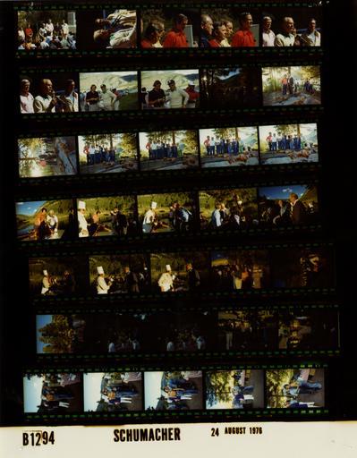 Keywords: Ford B1294 NLGRF photo contact sheet (1976-08-24)(Gerald Ford Library).jpg White House Photographic Office WHPO is housed at the Gerald R Ford Presidential Library a branch of the National Archives and Records Administration NARA <br/><br/> This file is a 200 dpi photo contact sheet having images from roll of film B1294 of the August 9 1974 - January 20 1977 Gerald R Ford White House Photographic Office Series A0001-A9999 and B0001-B2886 photographs <br/><br/> The date on the photo contact sheet is the date the roll of film was processed not necessarily the date the photographs were taken See table below for additional details 1976-08-24 Gerald R Ford Presidential Library Image http //www fordlibrarymuseum gov/library/whphotos/B1294_NLGRF jpg B1294_NLGRF jpg from http //www fordlibrarymuseum gov/library/whphotos/19760824whpo pdf White House Photographs August 24 1976 of the http //www fordlibrarymuseum gov/Library/whphotos/whpo asp White House Photographic Collection page White House Photographic Office WHPO - Schumacher PD-USGov Institution Institution Gerald R Ford Presidential Library Table wikitable sortable + Photo contact sheet B1294 U S President Ford Administration Gerald R Ford Library Frame s Tone Subject proper Subject generic Names Geographic Location Photographer Date - 3-8 Color Vacation Trip to Vail Colorado - Question and Answer Session Following Campaign Meeting on Debates GRF standing at microphone speaking; others in background; various angles and distances; all not in frames GRF Cheney Morton Spencer Baker Teeter Raoul-Duval Greener Deardourff Bailey Nessen Jones Jack Ford Channock Vail CO Presidential Vacation Residence - Richard Bass Residence - Outside Schumacher 1976-08-24 - 9-10 Color Vacation Trip to Vail Colorado - Round of Golf standing talking; golf cart and mountains in background GRF Unidentified Man Vail CO Vail Golf Course Schumacher 1976-08-24 - 11-17 Color Vacation Trip to Vail Colorado - Picnic Hosted by Pepi and Shieka Gramshammer standing posing; pigs roasting over fire in foreground; all not in every frame; leisure suit GRF Unidentified Group Vail CO Vail Golf Course Schumacher 1976-08-25 - 18-20 Color Vacation Trip to Vail Colorado - Picnic Hosted by Pepi and Shieka Gramshammer GRF watching pig being cut up; smoking pipe; Leisure Suit; GRF not in all frames GRF Chef Others Vail CO Vail Golf Course Schumacher 1976-08-25 - 21-22 Color Vacation Trip to Vail Colorado - Picnic Hosted by Pepi and Shieka Gramshammer standing talking; all not in both frames; leisure suit GRF Others Vail CO Vail Golf Course Schumacher 1976-08-25 - 23-25 Color Vacation Trip to Vail Colorado - Picnic Hosted by Pepi and Shieka Gramshammer standing talking; GRF smoking pipe; Leisure Suit GRF Chef Others Vail CO Vail Golf Course Schumacher 1976-08-25 - 26-37 Color Vacation Trip to Vail Colorado - Picnic Hosted by Pepi and Shieka Gramshammer standing talking posing eating; various angles and distances; all not in frames; leisure suit GRF Betty Ford Gramshammers Carlsons Cavaneys Cheneys Greener Greenspan Hartmanns Jones; Mortons Nessens O'Donnells Scowcroft Spencers Teeters Weidenfelds Owen Scanlon Gergens Cavanaughs Baker Lukash O'Laughlins Domina Others Vail CO Vail Golf Course Schumacher 1976-08-25 Gerald R Ford Presidential Library and Museum-cooperation PD-USGov Contact sheets by the Ford White House August 1976