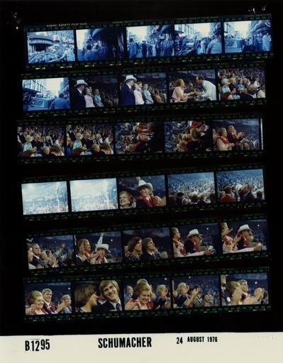 Keywords: Ford B1295 NLGRF photo contact sheet (1976-08-18)(Gerald Ford Library).jpg White House Photographic Office WHPO is housed at the Gerald R Ford Presidential Library a branch of the National Archives and Records Administration NARA <br/><br/> This file is a 200 dpi photo contact sheet having images from roll of film B1295 of the August 9 1974 - January 20 1977 Gerald R Ford White House Photographic Office Series A0001-A9999 and B0001-B2886 photographs <br/><br/> The date on the photo contact sheet is the date the roll of film was processed not necessarily the date the photographs were taken See table below for additional details 1976-08-18 Gerald R Ford Presidential Library Image http //www fordlibrarymuseum gov/library/whphotos/B1295_NLGRF jpg B1295_NLGRF jpg from http //www fordlibrarymuseum gov/library/whphotos/19760818whpo pdf White House Photographs August 18 1976 of the http //www fordlibrarymuseum gov/Library/whphotos/whpo asp White House Photographic Collection page White House Photographic Office WHPO - Schumacher PD-USGov Institution Institution Gerald R Ford Presidential Library Table wikitable sortable + Photo contact sheet B1295 U S President Ford Administration Gerald R Ford Library Frame s Tone Subject proper Subject generic Names Geographic Location Photographer Date - 2-7 Color Trip to Kansas City Missouri - Convention - Arrival at the Radisson Meuhlebach Hotel GRF and BF standing waving; stepping toward vehicle; limousine movingin last frame; various angles and distances; all not in every frame GRF Betty Ford Keiser Secret Service Crowd Kansas City MO Radisson Meuhlebach Hotel - Outside Schumacher 1976-08-18 - 8-9 Color Trip to Kansas City Missouri - Convention - Ford Family at the Republican National Convention standing singing; Steve Ford wearing cowboy hat Betty Ford Susan Ford Steve Ford Jack Ford Others Kansas City MO Kemper Arena Schumacher 1976-08-18 - 10 Color Trip to Kansas City Missouri - Convention - Ford Family at the Republican National Convention handshaking talking Betty Ford Unidentified Man Kansas City MO Kemper Arena Schumacher 1976-08-18 - 11-16 Color Trip to Kansas City Missouri - Convention - Ford Family at the Republican National Convention seated listening talking; BF weaing lei various angles; all not in every frame Nelson Happy Rockefeller Betty Ford Susan Ford Steve Ford Jack Ford Connallys Others Crowd Kansas City MO Kemper Arena Schumacher 1976-08-18 - 17-18 Color Trip to Kansas City Missouri - Convention demomstarting; long shots from higher level Delegates Alternates Crowd Kansas City MO Kemper Arena - Floor Schumacher 1976-08-18 - 19 Color Trip to Kansas City Missouri - Convention - Ford Family at the Republican National Convention smiling close up; Steve waring cowboy hat; BF weaing lei Betty Ford Steve Ford Kansas City MO Kemper Arena Schumacher 1976-08-18 - 20-21 Color Trip to Kansas City Missouri - Convention - Ford Family at the Republican National Convention standing taken from behind looking toward floor Tom Ford; Others Crowd Kansas City MO Kemper Arena Schumacher 1976-08-18 - 22 Color Trip to Kansas City Missouri - Convention standing applauding; close up profile C Hills R Hills Others Kansas City MO Kemper Arena Schumacher 1976-08-18 - 23 Color Trip to Kansas City Missouri - Convention - Ford Family at the Republican National Convention standing applauding; Steve waring cowboy hat; BF weaing lei Betty Ford Steve Ford Kansas City MO Kemper Arena Schumacher 1976-08-18 - 24 Color Trip to Kansas City Missouri - Convention - Ford Family at the Republican National Convention seated stoic; close up profile Mike Gayle Ford Kansas City MO Kemper Arena Schumacher 1976-08-18 - 25-27 Color Trip to Kansas City Missouri - Convention - Ford Family at the Republican National Convention standing applauding; Steve waring cowboy hat in 1st 2 frames; BF weaing lei Betty Ford Steve Ford Kansas City MO Kemper Arena Schumacher 1976-08-18 - 28 Color Trip to Kansas City Missouri - Convention - Ford Family at the Republican National Convention seated smiling; close up profile Mike Gayle Ford Kansas City MO Kemper Arena Schumacher 1976-08-18 - 29 Color Trip to Kansas City Missouri - Convention - Ford Family at the Republican National Convention smiling; close up; weaing lei Betty Ford Kansas City MO Kemper Arena Schumacher 1976-08-18 - 30-31 Color Trip to Kansas City Missouri - Convention - Ford Family at the Republican National Convention standing applauding; obscured by applauding hands; all not in both frames Susan Ford Sonny Bono; Betty Ford Steve Ford Others Kansas City MO Kemper Arena Schumacher 1976-08-18 Gerald R Ford Presidential Library and Museum-cooperation PD-USGov Contact sheets by the Ford White House August 1976 |