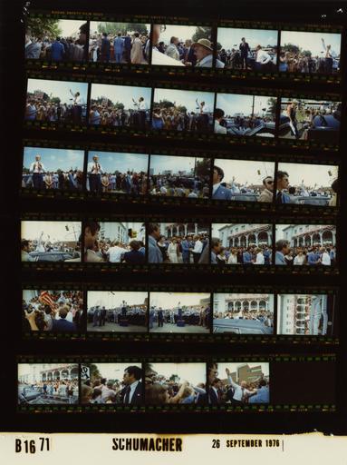 | Keywords: Ford B1671 NLGRF photo contact sheet (1976-09-26)(Gerald Ford Library).jpg White House Photographic Office WHPO is housed at the Gerald R Ford Presidential Library a branch of the National Archives and Records Administration NARA <br/><br/> This file is a 200 dpi photo contact sheet having images from roll of film B1671 of the August 9 1974 - January 20 1977 Gerald R Ford White House Photographic Office Series A0001-A9999 and B0001-B2886 photographs <br/><br/> The date on the photo contact sheet is the date the roll of film was processed not necessarily the date the photographs were taken See table below for additional details 1976-09-26 Gerald R Ford Presidential Library Image http //www fordlibrarymuseum gov/library/whphotos/B1671_NLGRF jpg B1671_NLGRF jpg from http //www fordlibrarymuseum gov/library/whphotos/19760926whpo pdf White House Photographs September 26 1976 of the http //www fordlibrarymuseum gov/Library/whphotos/whpo asp White House Photographic Collection page White House Photographic Office WHPO - Schumacher PD-USGov Institution Institution Gerald R Ford Presidential Library Table wikitable sortable + Photo contact sheet B1671 U S President Ford Administration Gerald R Ford Library Frame s Tone Subject proper Subject generic Names Geographic Location Photographer Date - 3A-5A Color Campaign Trip to Mississippi - Rally in Bay St Louis MS greeting handshaking standing talking; various angles and distances; all not in every frame GRF Crowd Bay St Louis MS Near Hancock County Public Library Schumacher 1976-09-26 - 6A Color Campaign Trip to Mississippi - Rally in Bay St Louis MS Lott on platform holding microphone speaking; GRF standing nearby coatless; others in background GRF Trent Lott Crowd Bay St Louis MS Near Hancock County Public Library Schumacher 1976-09-26 - 7A-11A Color Campaign Trip to Mississippi - Rally in Bay St Louis MS GRF on platform holding microphone speaking; coatless; all not in frames; last frame long shot GRF Crowd Others Bay St Louis MS Near Hancock County Public Library Schumacher 1976-09-26 - 12A Color Campaign Trip to Mississippi - Rally in Bay St Louis MS seated next to car in parking lot; typing into transcription machine; other person standing nearby Transcriptionist Bay St Louis MS Near Hancock County Public Library Schumacher 1976-09-26 - 13A-15A Color Campaign Trip to Mississippi - Rally in Bay St Louis MS GRF on platform holding microphone speaking; coatless; all not in frames; last frame long shot GRF Crowd Others Bay St Louis MS Near Hancock County Public Library Schumacher 1976-09-26 - 16A-18A Color Campaign Trip to Mississippi GRF waving standing in limousine top half of body through sun roof; crowd and Sears store in background GRF Secret Service Crowd Gulfport MS Street Schumacher 1976-09-26 - 19A-31A Color Campaign Trip to Mississippi GRF standing through limousine sun roof speaking in shirtsleeves; Gulfport Welcomes President Ford sign hanging in background; various angles and distances; all not in every frame GRF Crowd Gulfport MS Main Post Office - Outside Schumacher 1976-09-26 Gerald R Ford Presidential Library and Museum-cooperation PD-USGov Contact sheets by the Ford White House September 1976 |
