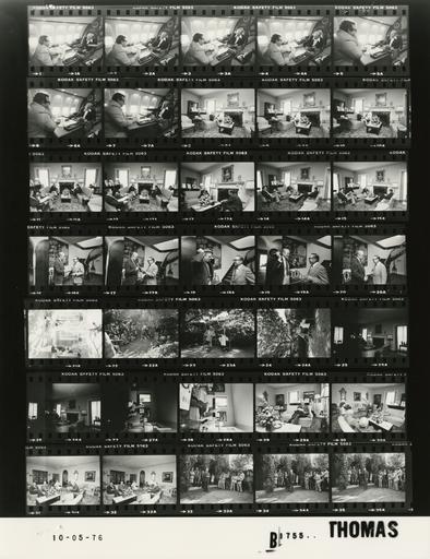 | Keywords: Ford B1755 NLGRF photo contact sheet (1976-10-04)(Gerald Ford Library).jpg White House Photographic Office WHPO is housed at the Gerald R Ford Presidential Library a branch of the National Archives and Records Administration NARA <br/><br/> This file is a 200 dpi photo contact sheet having images from roll of film B1755 of the August 9 1974 - January 20 1977 Gerald R Ford White House Photographic Office Series A0001-A9999 and B0001-B2886 photographs <br/><br/> The date on the photo contact sheet is the date the roll of film was processed not necessarily the date the photographs were taken See table below for additional details 1976-10-04 Gerald R Ford Presidential Library Image http //www fordlibrarymuseum gov/library/whphotos/B1755_NLGRF jpg B1755_NLGRF jpg from http //www fordlibrarymuseum gov/library/whphotos/19761004whpo pdf White House Photographs October 4 1976 of the http //www fordlibrarymuseum gov/Library/whphotos/whpo asp White House Photographic Collection page White House Photographic Office WHPO - Thomas PD-USGov Institution Institution Gerald R Ford Presidential Library Table wikitable sortable + Photo contact sheet B1755 U S President Ford Administration Gerald R Ford Library Frame s Tone Subject proper Subject generic Names Geographic Location Photographer Date - 1A-7A BW Flight To California -Newsweek Correspondent seated at table talking; DeFrank taking notes in small pad GRF Tom DeFrank Air Force One - President's Cabin Thomas 1976-10-04 - 8A-10A BW Campaign Trip To California seated on sofa reading newspaper; casual dress GRF Pacific Heights CA Sutro Residence - Living Room Thomas 1976-10-05 - 11A-15A BW Campaign Trip To California - Interview with Syndicated Columnist seated around coffee table; GRF in casual dress; various angles and distances; Cheney not in every frame GRF Joseph Kraft Cheney Pacific Heights CA Sutro Residence - Living Room Thomas 1976-10-05 - 21A BW Campaign Trip To California - Republican Candidate for US Senator from California walking; casual dress GRF Samuel Hayakawa Pacific Heights CA Sutro Residence - Back Yard/Garden Thomas 1976-10-05 - 22A BW Campaign Trip To California - Meeting with Republican Candidate for United States Senator from California GRF and Hayakawa seated on right; media behind rope on left of frame; casual dress GRF Samuel Hayakawa Media Pacific Heights CA Sutro Residence - Back Yard/Garden Thomas 1976-10-05 - 23A-24A BW Campaign Trip To California - Meeting with Republican Candidate for United States Senator from California seated talking; medium range; casual dress GRF Samuel Hayakawa Pacific Heights CA Sutro Residence - Back Yard/Garden Thomas 1976-10-05 - 25A-29A BW Campaign Trip To California seated reading documents holding smoking pipe GRF Pacific Heights CA Sutro Residence - Living Room Thomas 1976-10-05 - 16A-20A BW Campaign Trip To California - Meeting with Republican Candidate for United States Senator from California dtanding talking; GRF trying on beret in middle frame; casual dress GRF Samuel Hayakawa Pacific Heights CA Sutro Residence - Vestibule Thomas 1976-10-06 - 30A-32A BW Campaign Trip To California - Imeeting With the Co-Chairs of the Citizens for Ford Committee President Ford Committee PFC to the Media seated talking around coffee table; various angles and distances GRF Edith Green George Feldman Dominic DiMaggio Unidentified Woman Pacific Heights CA Sutro Residence - Living Room Thomas 1976-10-06 - 33A-35A BW Campaign Trip To California - Introduction of the Co-Chairs of the Citizens for Ford Committee President Ford Committee PFC to the Media GRF speaking at microphone; others standing behind; long shots GRF Edith Green George Feldman Dominic DiMaggio; Media Pacific Heights CA Sutro Residence - Outside Thomas 1976-10-06 Gerald R Ford Presidential Library and Museum-cooperation PD-USGov Contact sheets by the Ford White House October 1976 |