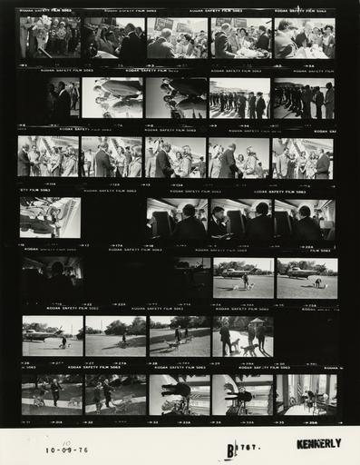 | Keywords: Ford B1767 NLGRF photo contact sheet (1976-10-10)(Gerald Ford Library).jpg White House Photographic Office WHPO is housed at the Gerald R Ford Presidential Library a branch of the National Archives and Records Administration NARA <br/><br/> This file is a 200 dpi photo contact sheet having images from roll of film B1767 of the August 9 1974 - January 20 1977 Gerald R Ford White House Photographic Office Series A0001-A9999 and B0001-B2886 photographs <br/><br/> The date on the photo contact sheet is the date the roll of film was processed not necessarily the date the photographs were taken See table below for additional details 1976-10-10 Gerald R Ford Presidential Library Image http //www fordlibrarymuseum gov/library/whphotos/B1767_NLGRF jpg B1767_NLGRF jpg from http //www fordlibrarymuseum gov/library/whphotos/19761010whpo pdf White House Photographs October 10 1976 of the http //www fordlibrarymuseum gov/Library/whphotos/whpo asp White House Photographic Collection page White House Photographic Office WHPO <br/> Creator David Hume Kennerly PD-USGov Institution Institution Gerald R Ford Presidential Library Table wikitable sortable + Photo contact sheet B1767 U S President Ford Administration Gerald R Ford Library Frame s Tone Subject proper Subject generic Names Geographic Location Photographer Date - 1A-5A BW Campaign Trip to Texas - Prior to Departure for Andrews Air Force Base greeting handshaking standing talking; GRF looking at baby in some frames; various angles and distances; all not in every frame GRF Crowd Amigos for Ford Dallas TX Love Field Kennerly 1976-10-10 - 6A-16A BW Campaign Trip to Texas - Prior to Departure for Andrews Air Force Base - Republican Candidate for 5th Congressional District of Texas greeting handshaking standing talking; various angles and distances; all not in every frame; Air Force One in some frames GRF Police Officers Nancy Judy Others Dallas TX Love Field Kennerly 1976-10-10 - 17A BW Kennerly 1976-10-10 - 18A-21A BW Flight from Dallas Texas to Andrews Air Force Base seated talking; O'Donnell not in 1st frame; Nessen's back to camera O'Donnell Nessen Cheney Air Force One Kennerly 1976-10-10 - 22A BW Kennerly 1976-10-10 - 23A-28A BW Arrival from Andrews Air Force Base; Pet Golden Retrievers GRF walking dogs on leash; Marine One helicopter and Washington Monument in some frames GRF Liberty Misty South Lawn Kennerly 1976-10-10 - 29A BW Arrival from Andrews Air Force Base; Pet Golden Retrievers walking; dogs on leashes; Barrett in uniform back to camera; guard shack in background GRF Liberty Misty; Scowcroft Barrett South Driveway Kennerly 1976-10-10 - 30A BW Kennerly 1976-10-10 - 31A-32A BW Arrival from Andrews Air Force Base; Pet Golden Retrievers walking; dogs on leashes; BS wearing plaid pants GRF Liberty Misty; Scowcroft Sidewalk between Oval Office and South Driveway Kennerly 1976-10-10 - 33A-35A BW Pet Golden Retrievers GRF back to camera; removing leashes petting dogs; both dogs not in all frames GRF Liberty Misty Oval Office Kennerly 1976-10-10 Gerald R Ford Presidential Library and Museum-cooperation PD-USGov Contact sheets by the Ford White House October 1976 Photographs by David Hume Kennerly from 1976 |