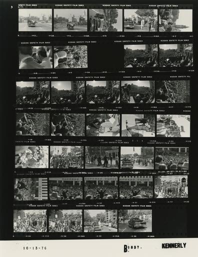 | Keywords: Ford B1837 NLGRF photo contact sheet (1976-10-13)(Gerald Ford Library).jpg White House Photographic Office WHPO is housed at the Gerald R Ford Presidential Library a branch of the National Archives and Records Administration NARA <br/><br/> This file is a 200 dpi photo contact sheet having images from roll of film B1837 of the August 9 1974 - January 20 1977 Gerald R Ford White House Photographic Office Series A0001-A9999 and B0001-B2886 photographs <br/><br/> The date on the photo contact sheet is the date the roll of film was processed not necessarily the date the photographs were taken See table below for additional details 1976-10-13 Gerald R Ford Presidential Library Image http //www fordlibrarymuseum gov/library/whphotos/B1837_NLGRF jpg B1837_NLGRF jpg from http //www fordlibrarymuseum gov/library/whphotos/19761013whpo pdf White House Photographs October 13 1976 of the http //www fordlibrarymuseum gov/Library/whphotos/whpo asp White House Photographic Collection page White House Photographic Office WHPO <br/> Creator David Hume Kennerly PD-USGov Institution Institution Gerald R Ford Presidential Library Table wikitable sortable + Photo contact sheet B1837 U S President Ford Administration Gerald R Ford Library Frame s Tone Subject proper Subject generic Names Geographic Location Photographer Date - 3-4 BW Campaign Trip to New York; Motorcade to Campaign Rally in Yonkers - Yonkers New York riding in limousine; rolling away from camera; long shots; Yonkers City Hall in background Secret Service Yonkers NY Street Kennerly 1976-10-13 - 5-6 BW Campaign Trip to New York; Motorcade to Campaign Rally in Yonkers - Yonkers New York GRF waving riding in lead vehicle; Secret Riding in 2nd limousine; rolling away from camera; close up; Yonkers City Hall in background GRF Secret Service Yonkers NY Street Kennerly 1976-10-13 - 7-9 BW Campaign Trip to New York; Arrival for Campaign Rally in Yonkers - Yonkers New York greeting handshaking talking; GRF not in all frames; all not in every frame GRF Crowd Others Yonkers NY Yonkers City Hall - Outside Kennerly 1976-10-13 - 10 BW Kennerly 1976-10-13 - 11-19 BW Campaign Trip to New York; Campaign Rally in Yonkers - Yonkers New York GRF at lectern speaking; crowd on left of frame; taken from left of GRF GRF Sens Javits Buckley; Rosenbaum Mayor Martinelli Malcolm Wilson J O'Rourke Platform Guests; Crowd Yonkers NY Yonkers City Hall - Outside Kennerly 1976-10-13 - 20 BW Campaign Trip to New York; Following Signing Ceremony for H R 13367 The State and Local Fiscal Assistance Amendments of 1976 General Revenue Sharing - Yonkers New York standing; GRF hold signed copy of H R 13367 The State and Local Fiscal Assistance Amendments of 1976 General Revenue Sharing; Wydler appaluding GRF Rep Wydler Yonkers NY Yonkers City Hall - Outside Kennerly 1976-10-13 - 21 BW Campaign Trip to New York; Following Signing Ceremony for H R 13367 The State and Local Fiscal Assistance Amendments of 1976 General Revenue Sharing - Yonkers New York holding telephone receiver to ear; writing on paper; telephone on sidewalk Unidentified Man Yonkers NY Yonkers City Hall - Outside Kennerly 1976-10-13 - 22 BW Campaign Trip to New York; Following Signing Ceremony for H R 13367 The State and Local Fiscal Assistance Amendments of 1976 General Revenue Sharing - Yonkers New York standing by Moczydlowski street sign Secret Service Media Yonkers NY Yonkers City Hall - Outside Kennerly 1976-10-13 - 23 BW Campaign Trip to New York; Following Signing Ceremony for H R 13367 The State and Local Fiscal Assistance Amendments of 1976 General Revenue Sharing - Yonkers New York close up; holding bouquet of flowers O'Donnell Yonkers NY Yonkers City Hall - Outside Kennerly 1976-10-13 - 24-26 BW Campaign Trip to New York - Motorcade to White Plains NY police moving crowd behind rope in 2nd frame; secret service riding in limousine in other Police Officers Secret Service Crowd NY Street Kennerly 1976-10-13 - 27-31 BW Campaign Trip to New York; Campaign Rally in White Plains -White Plains New York GRF at lectern speaking back to camera; crowd in background some holding signs GRF Platform Guests Crowd White Plains NY White Plains City Hall - Outside Kennerly 1976-10-13 - 35-36 BW Campaign Trip to New York - Motorcade to Campaign Rally in Paramus NJ riding in limousine; rolling away from camera; long shots; looking up at building rooftop in 1st frame Secret Service NY Street Kennerly 1976-10-13 Gerald R Ford Presidential Library and Museum-cooperation PD-USGov Contact sheets by the Ford White House October 1976 Photographs by David Hume Kennerly from 1976 |