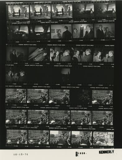| Keywords: Ford B1838 NLGRF photo contact sheet (1976-10-13)(Gerald Ford Library).jpg White House Photographic Office WHPO is housed at the Gerald R Ford Presidential Library a branch of the National Archives and Records Administration NARA <br/><br/> This file is a 200 dpi photo contact sheet having images from roll of film B1838 of the August 9 1974 - January 20 1977 Gerald R Ford White House Photographic Office Series A0001-A9999 and B0001-B2886 photographs <br/><br/> The date on the photo contact sheet is the date the roll of film was processed not necessarily the date the photographs were taken See table below for additional details 1976-10-13 Gerald R Ford Presidential Library Image http //www fordlibrarymuseum gov/library/whphotos/B1838_NLGRF jpg B1838_NLGRF jpg from http //www fordlibrarymuseum gov/library/whphotos/19761013whpo pdf White House Photographs October 13 1976 of the http //www fordlibrarymuseum gov/Library/whphotos/whpo asp White House Photographic Collection page White House Photographic Office WHPO <br/> Creator David Hume Kennerly PD-USGov Institution Institution Gerald R Ford Presidential Library Table wikitable sortable + Photo contact sheet B1838 U S President Ford Administration Gerald R Ford Library Frame s Tone Subject proper Subject generic Names Geographic Location Photographer Date - 1A-3A BW Campaign Trip to New York standing talking GRF Nessen Unidentified Man New York NY New York Hilton Hotel President's Suite Kennerly 1976-10-13 - 4A-7A BW Campaign Trip to New York - Prior to Interview with ABC News Correspondent GRF seated on sofa in all frames; Nessen standing leaning on TV and stand; seated in last frame GRF Nessen New York NY New York Hilton Hotel President's Suite Kennerly 1976-10-13 - 8A-11A BW Campaign Trip to New York - Interview with ABC News Correspondent standing talking; some motion; head and shoulder portraits GRF Barbara Walters New York NY New York Hilton Hotel - Room 3826 Kennerly 1976-10-13 - 12A BW Campaign Trip to New York standing; photo taken accidentally men at 45 degree angle Two Unidentified Men New York NY New York Hilton Hotel Kennerly 1976-10-13 - 13A-16A BW Campaign Trip to New York standing talking greeting handshaking; all not in every frame GRF Unidentified Men New York NY New York Hilton Hotel Kennerly 1976-10-13 - 17A-20A BW Kennerly 1976-10-13 - 21A-35A BW Campaign Trip to New York; Campaign Rally in Yonkers - Yonkers New York GRF at lectern speaking; crowd on left of frame; taken from left of GRF; last frame taken from front; various distances GRF Sens Javits Buckley; Rosenbaum Mayor Martinelli Malcolm Wilson J O'Rourke Platform Guests; Crowd Yonkers NY Yonkers City Hall - Outside Kennerly 1976-10-13 Gerald R Ford Presidential Library and Museum-cooperation PD-USGov Contact sheets by the Ford White House October 1976 Photographs by David Hume Kennerly from 1976 |