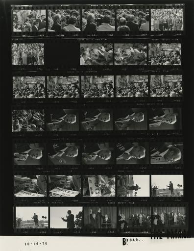 Keywords: Ford B1849 NLGRF photo contact sheet (1976-10-13)(Gerald Ford Library).jpg White House Photographic Office WHPO is housed at the Gerald R Ford Presidential Library a branch of the National Archives and Records Administration NARA <br/><br/> This file is a 200 dpi photo contact sheet having images from roll of film B1849 of the August 9 1974 - January 20 1977 Gerald R Ford White House Photographic Office Series A0001-A9999 and B0001-B2886 photographs <br/><br/> The date on the photo contact sheet is the date the roll of film was processed not necessarily the date the photographs were taken See table below for additional details 1976-10-13 Gerald R Ford Presidential Library Image http //www fordlibrarymuseum gov/library/whphotos/B1849_NLGRF jpg B1849_NLGRF jpg from http //www fordlibrarymuseum gov/library/whphotos/19761013whpo pdf White House Photographs October 13 1976 of the http //www fordlibrarymuseum gov/Library/whphotos/whpo asp White House Photographic Collection page White House Photographic Office WHPO - Fitz-Patrick PD-USGov Institution Institution Gerald R Ford Presidential Library Table wikitable sortable + Photo contact sheet B1849 U S President Ford Administration Gerald R Ford Library Frame s Tone Subject proper Subject generic Names Geographic Location Photographer Date - 2-5 BW Campaign Trip to New York; Campaign Rally in White Plains -White Plains New York greeting handshaking mingling; GRF's back to camera; close ups GRF Crowd White Plains NY White Plains City Hall - Outside Fitz-Patrick 1976-10-13 - 6-7 BW Campaign Trip to New York; Campaign Rally in White Plains -White Plains New York GRF at lectern speaking in second frame; taken from behind crowd GRF Platform Guests Crowd White Plains NY White Plains City Hall - Outside Kennerly 1976-10-13 - 8 BW Fitz-Patrick 1976-10-13 - 9-10 BW Campaign Trip to New York - Campaign Rally at Rockland County Courthouse greeting handshaking mingling; GRF's back to camera; close ups GRF Crowd New York NY Rockland County Courthouse -Outside Fitz-Patrick 1976-10-13 - 11-17 BW Campaign Trip to New York - Campaign Rally at Rockland County Courthouse GRF at lectern speaking; crowd in foreground; taken from behind crowd and to right of GRF GRF Platform Guests Crowd New York NY Rockland County Courthouse -Outside Fitz-Patrick 1976-10-13 - 18-26 BW Campaign Trip to New York - Campaign Rally at Rockland County Courthouse speaking gesturing; head and shoulder portraits; close ups taken from left of GRF GRF New York NY Rockland County Courthouse -Outside Fitz-Patrick 1976-10-13 - 27-29 BW Campaign Trip to New York - Campaign Rally at Rockland County Courthouse wearing Ford's My Man sign around neck Cat New York NY Rockland County Courthouse -Outside Fitz-Patrick 1976-10-13 - 30-33 BW Campaign Trip to New Jersey; Campaign Rally in Union - Union New Jersey standing on roof of limousine; holding microphone speaking; various angles; almost sillhouette GRF Union NJ Town and Campus Inn - Outside Fitz-Patrick 1976-10-13 - 34 BW Campaign Trip to New Jersey; Reception Hosted by New Jersey President Ford Committee PFC - Union New Jersey standing behind lectern; holding raised arms over heads GRF Rep Rinaldo Union NJ Town and Campus Inn - Ballroom Fitz-Patrick 1976-10-13 - 35 BW Campaign Trip to New Jersey; Reception Hosted by New Jersey President Ford Committee PFC - Union New Jersey standing behind lectern; Rinaldo speaking GRF Reps Rinaldo Fenwick; Others Union NJ Town and Campus Inn - Ballroom Fitz-Patrick 1976-10-13 - 36 BW Campaign Trip to New Jersey; Reception Hosted by New Jersey President Ford Committee PFC - Union New Jersey GRF at lectern arms raised over head; others standing applauding GRF Reps Rinaldo Fenwick; Others Union NJ Town and Campus Inn - Ballroom Fitz-Patrick 1976-10-13 Gerald R Ford Presidential Library and Museum-cooperation PD-USGov Contact sheets by the Ford White House October 1976 |