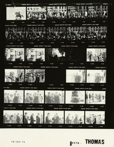 | Keywords: Ford B2078 NLGRF photo contact sheet (1976-10-23)(Gerald Ford Library).jpg White House Photographic Office WHPO is housed at the Gerald R Ford Presidential Library a branch of the National Archives and Records Administration NARA <br/><br/> This file is a 200 dpi photo contact sheet having images from roll of film B2078 of the August 9 1974 - January 20 1977 Gerald R Ford White House Photographic Office Series A0001-A9999 and B0001-B2886 photographs <br/><br/> The date on the photo contact sheet is the date the roll of film was processed not necessarily the date the photographs were taken See table below for additional details 1976-10-23 Gerald R Ford Presidential Library Image http //www fordlibrarymuseum gov/library/whphotos/B2078_NLGRF jpg B2078_NLGRF jpg from http //www fordlibrarymuseum gov/library/whphotos/19761023whpo pdf White House Photographs October 23 1976 of the http //www fordlibrarymuseum gov/Library/whphotos/whpo asp White House Photographic Collection page White House Photographic Office WHPO <br/> Creator David Hume Kennerly PD-USGov Institution Institution Gerald R Ford Presidential Library Table wikitable sortable + Photo contact sheet B2078 U S President Ford Administration Gerald R Ford Library Frame s Tone Subject proper Subject generic Names Geographic Location Photographer Date - 4A BW Campaign Trip to Virginia; Prior to Rally in Front of State Capitol -Richmond Virginia Statue of George Washington Richmond VA Virginia State Capitol -Grounds Kennerly 1976-10-23 - 5A-13A BW Campaign Trip to Virginia; Rally in Front of State Capitol; Governor of Virginia VA - Richmond Virginia greeting handshaking mingling; various angles and distances; all not in every frame GRF Gov Godwin Crowd Others Richmond VA Virginia State Capitol -Grounds Kennerly 1976-10-23 - 14A-15A BW Campaign Trip to Virginia; Rally in Front of State Capitol - Richmond Virginia GRF standing speaking at lectern; taken from lower vantage point; Washington Statue Monument in background GRF Others Richmond VA Virginia State Capitol -Grounds Kennerly 1976-10-23 - 16A-17A BW Campaign Trip to Virginia; Rally in Front of State Capitol - Richmond Virginia at lectern speaking; 2nd frame very dark GRF Richmond VA Virginia State Capitol -Grounds Kennerly 1976-10-23 - 18A-20A BW Campaign Trip to Virginia; Rally in Front of State Capitol; Governor of Virginia VA - Richmond Virginia standing at lectern waving; arm-in-arm GRF Gov Godwin Richmond VA Virginia State Capitol -Grounds Kennerly 1976-10-23 - 21A BW Kennerly 1976-10-23 - 22A-26A BW Campaign Trip to North Carolina - Arrival in North Carolina greeting handshaking standing talking; Steve wearing cowboy hat; all not in every frame; Air Force One in some frames GRF Steve Ford Elizabeth Dole; Others Raleigh-Durham NC Raleigh-Durham Airport Kennerly 1976-10-23 - 27A-33A BW Campaign Trip to North Carolina - Arrival in North Carolina greeting handshaking standing talking; Steve wearing cowboy hat; all not in every frame; Air Force One in some frames GRF Steve Ford Others Raleigh-Durham NC Raleigh-Durham Airport Kennerly 1976-10-23 Gerald R Ford Presidential Library and Museum-cooperation PD-USGov Contact sheets by the Ford White House October 1976 Photographs by David Hume Kennerly from 1976 |