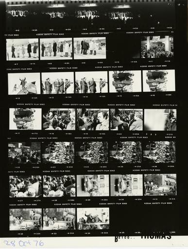 | Keywords: Ford B2100 NLGRF photo contact sheet (1976-10-27)(Gerald Ford Library).jpg White House Photographic Office WHPO is housed at the Gerald R Ford Presidential Library a branch of the National Archives and Records Administration NARA <br/><br/> This file is a 200 dpi photo contact sheet having images from roll of film B2100 of the August 9 1974 - January 20 1977 Gerald R Ford White House Photographic Office Series A0001-A9999 and B0001-B2886 photographs <br/><br/> The date on the photo contact sheet is the date the roll of film was processed not necessarily the date the photographs were taken See table below for additional details 1976-10-27 Gerald R Ford Presidential Library Image http //www fordlibrarymuseum gov/library/whphotos/B2100_NLGRF jpg B2100_NLGRF jpg from http //www fordlibrarymuseum gov/library/whphotos/19761027whpo pdf White House Photographs October 27 1976 of the http //www fordlibrarymuseum gov/Library/whphotos/whpo asp White House Photographic Collection page White House Photographic Office WHPO - Thomas PD-USGov Institution Institution Gerald R Ford Presidential Library Table wikitable sortable + Photo contact sheet B2100 U S President Ford Administration Gerald R Ford Library Frame s Tone Subject proper Subject generic Names Geographic Location Photographer Date - 2-5 BW Campaign Trip to Pennsylvania - Campaign Rally at the Valley Forge Music Fair GRF and others standing in bright theater-in-round in center of darkened room holding hands above heads; long shots from high vantage point GRF Others Crowd Devon PA Valley Forge Music Fair Thomas 1976-10-27 - 6 BW Thomas 1976-10-27 - 7-9 BW Campaign Trip to Indiana - Arrival in Indianapolis greeting handshaking; portion of Air Force One wing in background; all not in every frame GRF Gov Mrs Bowen Mayor William Hudnut III R Lugar D Cox T Milligan Indianapolis IN Weir-Cook Municipal Airport Thomas 1976-10-28 - 10 BW Thomas 1976-10-28 - 11 BW Campaign Trip to Indiana - Reception for Businessness Leaders for Ford standing listening; man holding Grits Fritz give me the Shitz sign in center of photo Crowd Indianapolis IN Scottish Masonic Rite Cathedral Thomas 1976-10-28 - 12 BW Campaign Trip to Ohio; Arrival in Cincinnati Ohio - Hebron Kentucky standing in doorway of Air Force One waving both arms over head; taken from ground level GRF Hebron KY Greater Cincinnati Airport Thomas 1976-10-28 - 13-17 BW Campaign Trip to Ohio; Arrival in Cincinnati Ohio - Hebron Kentucky greeting handshaking; various angles and distances; all not in every frame GRF Gov Rhodes Sen Taft W Keating; Ohio Republican PFC Leaders Hebron KY Greater Cincinnati Airport Thomas 1976-10-28 - 18-21 BW Campaign Trip to Ohio - Rally in Fountain Square Cincinnati OH greeting handshaking various angles and distances; all not in every frame; last frame light damaged GRF Crowd Cincinnati OH Fountain Square Thomas 1976-10-28 - 22-26 BW Campaign Trip to Ohio - Rally in Fountain Square Cincinnati OH GRF speaking at lectern; others in background; various distances; all not in every frame GRF; Sen Taft Gov Rhodes Others Cincinnati OH Fountain Square Thomas 1976-10-28 - 27-28 BW Campaign Trip to Ohio - Rally in Fountain Square Cincinnati OH standing listening; man in center taking photographs Crowd Cincinnati OH Fountain Square Thomas 1976-10-28 - 29-34 BW Campaign Trip to Ohio - Motorcade Following Rally in Fountain Square Cincinnati OH GRF and Taft riding in limousine; standing waving through sunroof; crowd on sidewalks; various angles and distances; all not in every frame GRF Sen Taft Crowd; Secret Service Cincinnati OH Downtown Streets Thomas 1976-10-28 Gerald R Ford Presidential Library and Museum-cooperation PD-USGov Contact sheets by the Ford White House October 1976 |