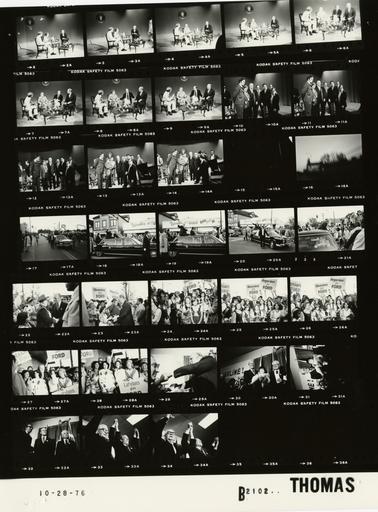 | Keywords: Ford B2102 NLGRF photo contact sheet (1976-10-28)(Gerald Ford Library).jpg White House Photographic Office WHPO is housed at the Gerald R Ford Presidential Library a branch of the National Archives and Records Administration NARA <br/><br/> This file is a 200 dpi photo contact sheet having images from roll of film B2102 of the August 9 1974 - January 20 1977 Gerald R Ford White House Photographic Office Series A0001-A9999 and B0001-B2886 photographs <br/><br/> The date on the photo contact sheet is the date the roll of film was processed not necessarily the date the photographs were taken See table below for additional details 1976-10-28 Gerald R Ford Presidential Library Image http //www fordlibrarymuseum gov/library/whphotos/B2102_NLGRF jpg B2102_NLGRF jpg from http //www fordlibrarymuseum gov/library/whphotos/19761028whpo pdf White House Photographs October 28 1976 of the http //www fordlibrarymuseum gov/Library/whphotos/whpo asp White House Photographic Collection page White House Photographic Office WHPO - Thomas PD-USGov Institution Institution Gerald R Ford Presidential Library Table wikitable sortable + Photo contact sheet B2102 U S President Ford Administration Gerald R Ford Library Frame s Tone Subject proper Subject generic Names Geographic Location Photographer Date - 2-5 BW Campaign Trip to Ohio - Prior to WJW Interview seated talking; 4th chair empty GRF Mike Ford Edith Green Cleveland OH WJW-TV Studio Thomas 1976-10-28 - 6-9 BW Campaign Trip to Ohio - Prior to WJW Interview seated talking GRF Mike Ford Edith Green Joe Garagiola Cleveland OH WJW-TV Studio Thomas 1976-10-28 - 10-14 BW Campaign Trip to Ohio - Following WJW Interview standing posing; all may not be in every frame GRF WJW Production Crew Cleveland OH WJW-TV Studio Thomas 1976-10-28 - 15-16 BW Thomas 1976-10-28 - 17-20 BW Campaign Trip to Ohio - Motorcade to Fleet Avenue and 53rd Street GRF and Taft riding in open limousine waving; secret service walking alongside; crowd on curbs; various angles and distances; all not in every frame GRF Sen Taft Secret Service Crowd Cleveland OH Streets Thomas 1976-10-28 - 21-23 BW Campaign Trip to Ohio - Rally at Fleet Avenue and 53rd Street GRF stepping from limousine in 1st frame; greeting handshaking talking to people in ethnic costumes in last 2 frames GRF Crowd Cleveland OH Fleet Avenue and 53rd Street Thomas 1976-10-28 - 24-28 BW Campaign Trip to Ohio - Rally at Fleet Avenue and 53rd Street standing posing; signs reading Slovenians for Ford Hungarians for Ford and Latvians for Ford are visible GRF; Women Children in Ethnic Costumes Cleveland OH Fleet Avenue and 53rd Street Thomas 1976-10-28 - 29-34 BW Campaign Trip to Ohio - Reception at Karlin Hall greeting handshaking in 1st frame; standing on stage arms raised above heads in balance GRF Others Cleveland OH Karlin Karline Hall Thomas 1976-10-28 Gerald R Ford Presidential Library and Museum-cooperation PD-USGov Contact sheets by the Ford White House October 1976 |