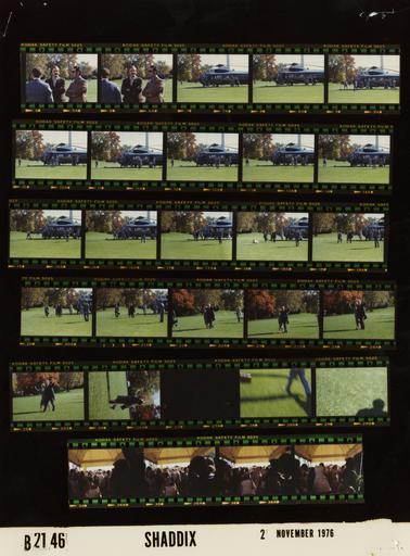 Keywords: Ford B2146 NLGRF photo contact sheet (1976-11-02)(Gerald Ford Library).jpg White House Photographic Office WHPO is housed at the Gerald R Ford Presidential Library a branch of the National Archives and Records Administration NARA <br/><br/> This file is a 200 dpi photo contact sheet having images from roll of film B2146 of the August 9 1974 - January 20 1977 Gerald R Ford White House Photographic Office Series A0001-A9999 and B0001-B2886 photographs <br/><br/> The date on the photo contact sheet is the date the roll of film was processed not necessarily the date the photographs were taken See table below for additional details 1976-11-02 Gerald R Ford Presidential Library Image http //www fordlibrarymuseum gov/library/whphotos/B2146_NLGRF jpg B2146_NLGRF jpg from http //www fordlibrarymuseum gov/library/whphotos/19761102whpo pdf White House Photographs November 2 1976 of the http //www fordlibrarymuseum gov/Library/whphotos/whpo asp White House Photographic Collection page White House Photographic Office WHPO - Shaddix PD-USGov Institution Institution Gerald R Ford Presidential Library Table wikitable sortable + Photo contact sheet B2146 U S President Ford Administration Gerald R Ford Library Frame s Tone Subject proper Subject generic Names Geographic Location Photographer Date - 5-6 Color Awaiting Arrival of Marine One with President Mrs Ford from Andrews Air Force Base standing talking arms folded; 1 with back to camera 3 Secret Service Agents South Lawn Shaddix 1976-11-02 - 7-9 Color Arrival of President Mrs Ford from Andrews Air Force Base standing near Marine One; helicopter door open; Washington Monument in background Military Personnel; Secret Service South Lawn Shaddix 1976-11-02 - 10-12 Color Arrival of President Mrs Ford from Andrews Air Force Base GRF and BF standing in door and on steps of Marine One helicopter waving; Washington Monument in background GRF Betty Ford; Military Personnel; Secret Service South Lawn Shaddix 1976-11-02 - 13-26 Color Arrival of President Mrs Ford from Andrews Air Force Base GRF and BF waving walking away from Marine One closer to camera in each frame; Washington Monument in background; helicopter and monument out of view in last 5 frames GRF Betty Ford; Military Personnel; Secret Service South Lawn Shaddix 1976-11-02 - 27-29 Color Shaddix 1976-11-02 - 30-33 Color Frames Missing -Sheet stops 29A and resumes at 34A Shaddix 1976-11-02 - 34-37 Color Arrival of President Mrs Ford from Andrews Air Force Base GRF walking toward camera greeting media; under South Portico canopy; all not in every frame; helicopter rotor blades from Marine One in background GRF Secret Service Media South Portico Shaddix 1976-11-02 Gerald R Ford Presidential Library and Museum-cooperation PD-USGov Contact sheets by the Ford White House November 1976