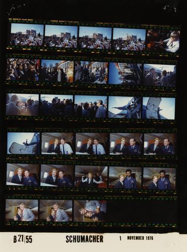 Keywords: Ford B2155 NLGRF photo contact sheet (1976-11-01)(Gerald Ford Library).jpg White House Photographic Office WHPO is housed at the Gerald R Ford Presidential Library a branch of the National Archives and Records Administration NARA <br/><br/> This file is a 200 dpi photo contact sheet having images from roll of film B2155 of the August 9 1974 - January 20 1977 Gerald R Ford White House Photographic Office Series A0001-A9999 and B0001-B2886 photographs <br/><br/> The date on the photo contact sheet is the date the roll of film was processed not necessarily the date the photographs were taken See table below for additional details 1976-11-01 Gerald R Ford Presidential Library Image http //www fordlibrarymuseum gov/library/whphotos/B2155_NLGRF jpg B2155_NLGRF jpg from http //www fordlibrarymuseum gov/library/whphotos/19761101whpo pdf White House Photographs November 1 1976 of the http //www fordlibrarymuseum gov/Library/whphotos/whpo asp White House Photographic Collection page White House Photographic Office WHPO - Schumacher PD-USGov Institution Institution Gerald R Ford Presidential Library Table wikitable sortable + Photo contact sheet B2155 U S President Ford Administration Gerald R Ford Library Frame s Tone Subject proper Subject generic Names Geographic Location Photographer Date - 1A-4A Color Betty Ford Campaign Trip to Pennsylvania - PFC Rally Prior to Departure for Michigan BF Connors and others on platform; band in foreground large S on back red uniforms; terminal in background; balloons being released upward; long shots Betty Ford Chuck Connors Crowd Unidentified Marching Band Harrisburg PA Harrisburg Capitol City Airport Schumacher 1976-11-01 - 5A Color Betty Ford Campaign Trip to Pennsylvania - PFC Rally Prior to Departure for Michigan - Actor greeting handshaking; taken from higher vantage point Chuck Connors Crowd Harrisburg PA Harrisburg Capitol City Airport Schumacher 1976-11-01 - 6A Color Betty Ford Campaign Trip to Pennsylvania - PFC Rally Prior to Departure for Michigan greeting handshaking; taken from higher vantage point Betty Ford Crowd; Secret Service Harrisburg PA Harrisburg Capitol City Airport Schumacher 1976-11-01 - 7A-9A Color Betty Ford Campaign Trip to Pennsylvania - PFC Rally Prior to Departure for Michigan BF speaking; hangar on right of frame Betty Ford Crowd; Secret Service Harrisburg PA Harrisburg Capitol City Airport Schumacher 1976-11-01 - 10A-13A Color Betty Ford Campaign Trip to Pennsylvania - Prior to Departure for Michigan handshaking saying goodbye; Tristar aircraft plane in all but last frame Betty Ford Others Harrisburg PA Harrisburg Capitol City Airport Schumacher 1976-11-01 - 14A-16A Color Betty Ford Campaign Trip to Pennsylvania - Prior to Departure for Michigan standing waving in doorway of Tristar aircraft plane ; taken from lower vantage point Betty Ford Harrisburg PA Harrisburg Capitol City Airport Schumacher 1976-11-01 - 17A-22A Color Flight to Detroit Michigan seated at table posing; two shots each of BF with individuals Betty Ford; Three Plane Air Force Personnel Aboard Tri-Star Aircraft plane Schumacher 1976-11-01 - 23A Color Flight to Detroit Michigan walking down aisle; waving arms Betty Ford Aboard Tri-Star Aircraft plane Schumacher 1976-11-01 - 24A-25A Color Flight to Detroit Michigan standing posing Betty Ford Unidentified Air Force Crewman Aboard Tri-Star Aircraft plane Schumacher 1976-11-01 - 26A-28A Color Flight to Detroit Michigan - Actor standing posing; arm-in-arm Betty Ford Chuck Connors Aboard Tri-Star Aircraft plane Schumacher 1976-11-01 Gerald R Ford Presidential Library and Museum-cooperation PD-USGov Contact sheets by the Ford White House November 1976