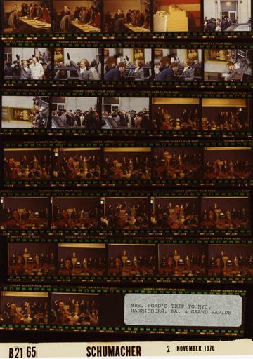 Keywords: Ford B2165 NLGRF photo contact sheet (1976-11-02)(Gerald Ford Library).jpg White House Photographic Office WHPO is housed at the Gerald R Ford Presidential Library a branch of the National Archives and Records Administration NARA <br/><br/> This file is a 200 dpi photo contact sheet having images from roll of film B2165 of the August 9 1974 - January 20 1977 Gerald R Ford White House Photographic Office Series A0001-A9999 and B0001-B2886 photographs <br/><br/> The date on the photo contact sheet is the date the roll of film was processed not necessarily the date the photographs were taken See table below for additional details 1976-11-02 Gerald R Ford Presidential Library Image http //www fordlibrarymuseum gov/library/whphotos/B2165_NLGRF jpg B2165_NLGRF jpg from http //www fordlibrarymuseum gov/library/whphotos/19761102whpo pdf White House Photographs November 2 1976 of the http //www fordlibrarymuseum gov/Library/whphotos/whpo asp White House Photographic Collection page White House Photographic Office WHPO - Schumacher PD-USGov Institution Institution Gerald R Ford Presidential Library Table wikitable sortable + Photo contact sheet B2165 U S President Ford Administration Gerald R Ford Library Frame s Tone Subject proper Subject generic Names Geographic Location Photographer Date - 2-4 Color Campaign Trip to Michigan - Prior to Voting in Presidential Election BF leaning over table signing register; GRF standing to BF's left; workers behind table on right GRF Betty Ford Election Workers East Grand Rapids MI Wealthy Elementary School - Auditorium Schumacher 1976-11-02 - 5 Color Campaign Trip to Michigan - Voting in Presidential Election standing behind voting machine; obscured by side walls of voting machine GRF East Grand Rapids MI Wealthy Elementary School - Auditorium Schumacher 1976-11-02 - 6-12 Color Campaign Trip to Michigan - Prior to Departure for Kent County Airport BF walking out of building waving; standing near limousine talking in some frames' various angles and distances; all not in every frame Bettty Ford Secret Service Crowd East Grand Rapids MI Pantlind Hotel -Outside Schumacher 1976-11-02 - 13-14 Color Campaign Trip to Michigan - Prior to Departure for Kent County Airport GRF standing by limousine; recognizing and pointing in 1st frame waving in 2nd frame; medium range shots from across street GRF Secret Service Crowd East Grand Rapids MI Pantlind Hotel -Outside Schumacher 1976-11-02 - 15-18 Color Campaign Trip to Michigan - Gerald R Ford Mural Dedication Ceremony GRF and BF arrive on stage waving; others standing applauding; long shots from back of room; all may not be in frames GRF Betty Ford Paul Collins A DeKracker Bobbie Butler Rep Vander Jagt Rev Brown David Mehney Crowd Grand Rapids MI Kent County Airport - Terminal Schumacher 1976-11-02 - 19-21 Color Campaign Trip to Michigan - Gerald R Ford Mural Dedication Ceremony Collins standing talking at lectern; others seated; long shots from back of room; all may not be in frames GRF Betty Ford Paul Collins A DeKracker Bobbie Butler Rep Vander Jagt Rev Brown David Mehney Crowd Grand Rapids MI Kent County Airport - Terminal Schumacher 1976-11-02 - 22-23 Color Campaign Trip to Michigan - Gerald R Ford Mural Dedication Ceremony all seated but Vander Jagt; others seated; smiling talking; long shots from back of room; all may not be in frames GRF Betty Ford Paul Collins A DeKracker Bobbie Butler Rep Vander Jagt Rev Brown David Mehney Crowd Grand Rapids MI Kent County Airport - Terminal Schumacher 1976-11-02 - 24-31 Color Campaign Trip to Michigan - Gerald R Ford Mural Dedication Ceremony GRF at lectern; waving talking; others standing applauding in 1st 2 frames seated listening in others; long shots from back of room; all may not be in frames GRF Betty Ford Paul Collins A DeKracker Bobbie Butler Rep Vander Jagt Rev Brown David Mehney Crowd Grand Rapids MI Kent County Airport - Terminal Schumacher 1976-11-02 - 32-33 Color Campaign Trip to Michigan - Gerald R Ford Mural Dedication Ceremony GRF and BF standing embracing; others standing applauding; long shots from back of room; all may not be in frames GRF Betty Ford Paul Collins A DeKracker Bobbie Butler Rep Vander Jagt Rev Brown David Mehney Crowd Grand Rapids MI Kent County Airport - Terminal Schumacher 1976-11-02 Gerald R Ford Presidential Library and Museum-cooperation PD-USGov Contact sheets by the Ford White House November 1976 |