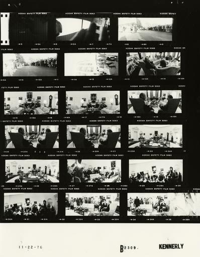 | Keywords: Ford B2309 NLGRF photo contact sheet (1976-11-22)(Gerald Ford Library).jpg White House Photographic Office WHPO is housed at the Gerald R Ford Presidential Library a branch of the National Archives and Records Administration NARA <br/><br/> This file is a 200 dpi photo contact sheet having images from roll of film B2309 of the August 9 1974 - January 20 1977 Gerald R Ford White House Photographic Office Series A0001-A9999 and B0001-B2886 photographs <br/><br/> The date on the photo contact sheet is the date the roll of film was processed not necessarily the date the photographs were taken See table below for additional details 1976-11-22 Gerald R Ford Presidential Library Image http //www fordlibrarymuseum gov/library/whphotos/B2309_NLGRF jpg B2309_NLGRF jpg from http //www fordlibrarymuseum gov/library/whphotos/19761122whpo pdf White House Photographs November 22 1976 of the http //www fordlibrarymuseum gov/Library/whphotos/whpo asp White House Photographic Collection page White House Photographic Office WHPO <br/> Creator David Hume Kennerly PD-USGov Institution Institution Gerald R Ford Presidential Library Table wikitable sortable + Photo contact sheet B2309 U S President Ford Administration Gerald R Ford Library Frame s Tone Subject proper Subject generic Names Geographic Location Photographer Date - 5-7 BW Test Shots Kennerly 1976-11-22 - 8A-10A BW Arrival of President-Elect Jimmy Carter Mrs Carter for Tour of White House Fords and Carters on left of frame; media and others on right on other side of driveway; long shots; BF in fur coat GRF Betty Ford Jimmy Carter Rosalynn Carter; Secret Service; Media; Others South Driveway Kennerly 1976-11-22 - 12A BW Arrival of President-Elect Jimmy Carter Mrs Carter for Tour of White House GRF and Carter walking across lawn; moving toward camera; others walking in background GRF Jimmy Carter; Secret Service Others Rose Garden Kennerly 1976-11-22 - 13A BW Meeting with President-Elect seated talking near fireplace; taken from behind GRF; some lens distortion GRF Jimmy Carter Oval Office Kennerly 1976-11-22 - 15A-17A BW Meeting with President-Elect seated talking near fireplace; long shots taken from in front of GRF's desk; some lens distortion GRF Jimmy Carter Oval Office Kennerly 1976-11-22 - 18A-22A BW Meeting with President-Elect seated at fireplace talking; taken from between GRF and Carter; close ups; GRF's desk in background; some lens distortion GRF Jimmy Carter Oval Office Kennerly 1976-11-22 - 24A-25A BW Meeting with President-Elect seated talking near fireplace; long shots taken from behind GRF's desk; desk in foreground; some lens distortion GRF Jimmy Carter Oval Office Kennerly 1976-11-22 - 27A-34A BW Meeting with President-Elect GRF and Carter seated talking near fireplace; media in arc around fireplace; various angles and distances; some lens distortion GRF Jimmy Carter; Media Oval Office Kennerly 1976-11-22 Gerald R Ford Presidential Library and Museum-cooperation PD-USGov Contact sheets by the Ford White House November 1976 Photographs by David Hume Kennerly from 1976 |