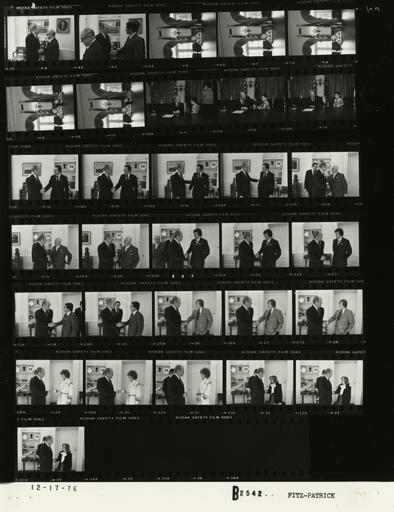 Keywords: Ford B2542 NLGRF photo contact sheet (1976-12-17)(Gerald Ford Library).jpg White House Photographic Office WHPO is housed at the Gerald R Ford Presidential Library a branch of the National Archives and Records Administration NARA <br/><br/> This file is a 200 dpi photo contact sheet having images from roll of film B2542 of the August 9 1974 - January 20 1977 Gerald R Ford White House Photographic Office Series A0001-A9999 and B0001-B2886 photographs <br/><br/> The date on the photo contact sheet is the date the roll of film was processed not necessarily the date the photographs were taken See table below for additional details 1976-12-17 Gerald R Ford Presidential Library Image http //www fordlibrarymuseum gov/library/whphotos/B2542_NLGRF jpg B2542_NLGRF jpg from http //www fordlibrarymuseum gov/library/whphotos/19761217whpo pdf White House Photographs December 17 1976 of the http //www fordlibrarymuseum gov/Library/whphotos/whpo asp White House Photographic Collection page White House Photographic Office WHPO - Fitz-Patrick PD-USGov Institution Institution Gerald R Ford Presidential Library Table wikitable sortable + Photo contact sheet B2542 U S President Ford Administration Gerald R Ford Library Frame s Tone Subject proper Subject generic Names Geographic Location Photographer Date - 4 BW Meeting to Discuss Senators' November Trip to the People's Republic of China PRC - US Senator from Nebraska NB greeting handshaking GRF Sen Curtis Oval Office Fitz-Patrick 1976-12-17 - 5 BW Meeting to Discuss Senators' November Trip to the People's Republic of China PRC - US Senator from Indiana IN greeting handshaking; Curtis walking away in foreground GRF Sen Bayh Sen Curtis Oval Office Fitz-Patrick 1976-12-17 - 6-10 BW Prior to GRF's Public Service Announcement over the Southern Carolina Educational Television Network seated at table Unidentified Boy Cabinet Room Fitz-Patrick 1976-12-17 - 11-13 BW Prior to GRF's Public Service Announcement over the Southern Carolina Educational Television Network seated talking at table GRF Unidentified Boy Cabinet Room Fitz-Patrick 1976-12-17 - 14-17 BW Prior to Photo Opportunity with New Jersey President Ford Committee PFC Staff greeting handshaking GRF Kendall Oval Office Fitz-Patrick 1976-12-17 - 18-20 BW Prior to Photo Opportunity with New Jersey President Ford Committee PFC Staff - Chairman greeting handshaking; Kendall in background GRF Tom Kean Kendall Oval Office Fitz-Patrick 1976-12-17 - 21-23 BW Photo Opportunity with New Jersey President Ford Committee PFC Staff - Chairman greeting handshaking GRF Unidentified Man A Cicatiello J LeBoutillier K LeFevre P Russo G Stevens Oval Office Fitz-Patrick 1976-12-17 - 24-25 BW Photo Opportunity with New Jersey President Ford Committee PFC Staff - Staff greeting handshaking GRF Unidentified Man A Cicatiello J LeBoutillier K LeFevre P Russo G Stevens Oval Office Fitz-Patrick 1976-12-17 - 26-28 BW Photo Opportunity with New Jersey President Ford Committee PFC Staff - Staff greeting handshaking GRF Unidentified Man A Cicatiello J LeBoutillier K LeFevre P Russo G Stevens Oval Office Fitz-Patrick 1976-12-17 - 29-31 BW Photo Opportunity with New Jersey President Ford Committee PFC Staff - Staff greeting handshaking GRF Unidentified Woman D Kean C Magadini R O'Brien J Stevens Oval Office Fitz-Patrick 1976-12-17 - 32-34 BW Photo Opportunity with New Jersey President Ford Committee PFC Staff - Staff greeting handshaking GRF Unidentified Woman D Kean C Magadini R O'Brien J Stevens Oval Office Fitz-Patrick 1976-12-17 Gerald R Ford Presidential Library and Museum-cooperation PD-USGov Contact sheets by the Ford White House December 1976 Public service announcements |